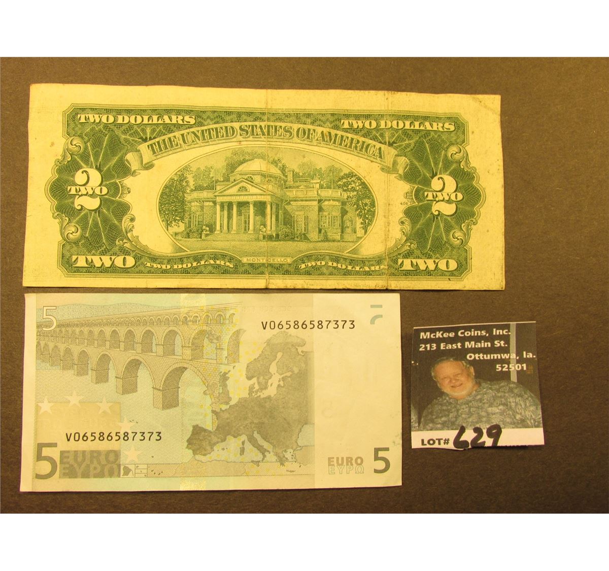 Series 1953C $2 U.S. Note "Red Seal", small tear at lower left; & Series 2002 $5 Euro Bank note.
