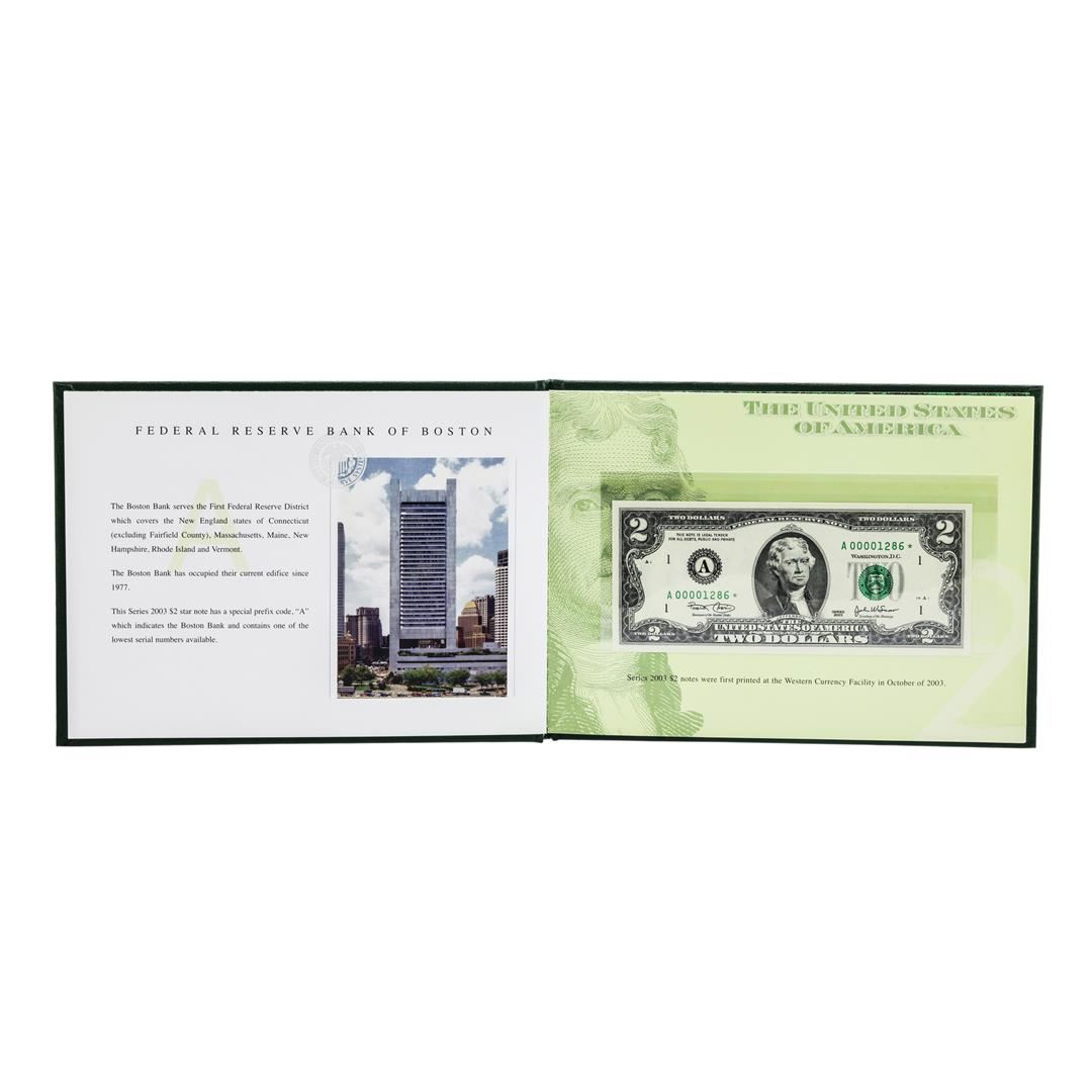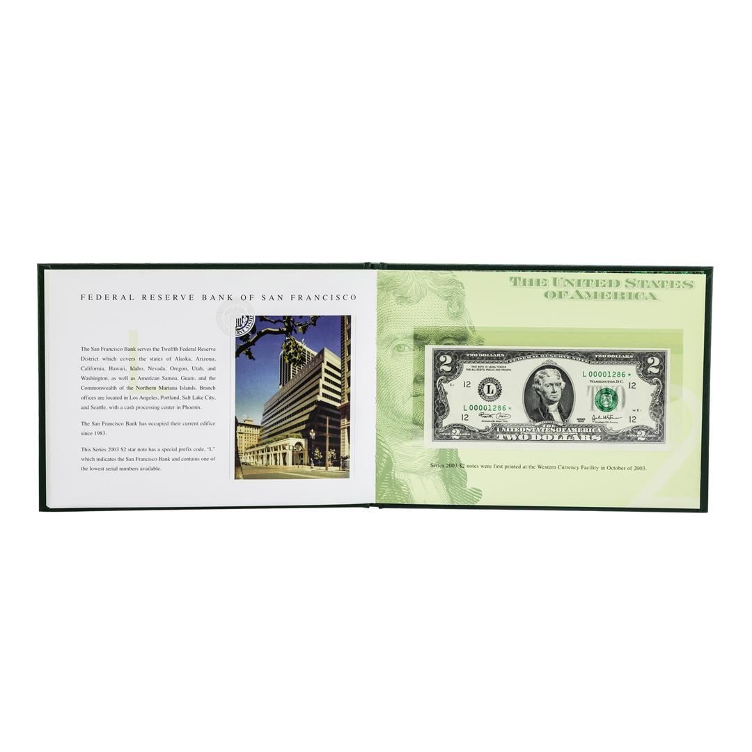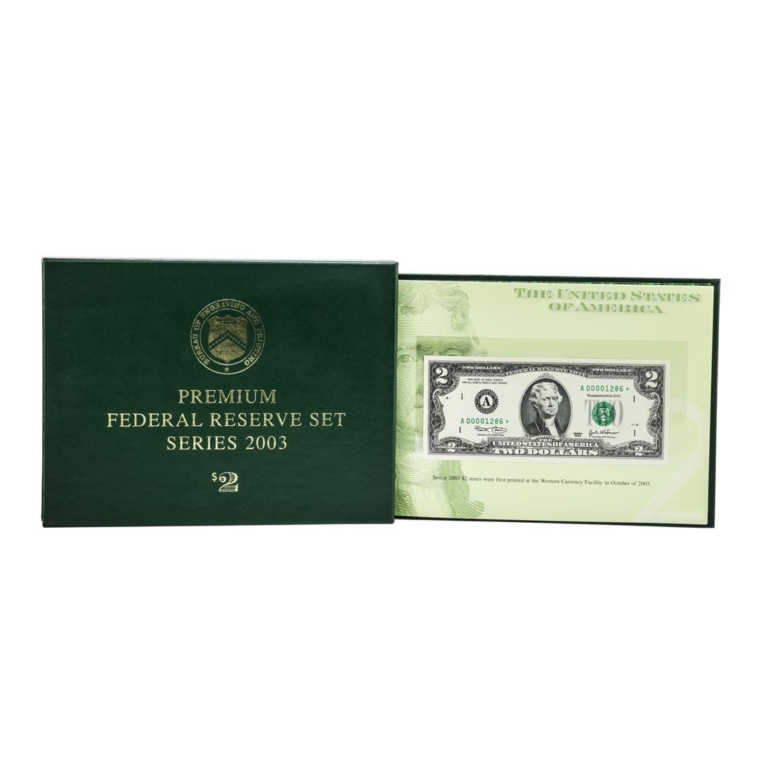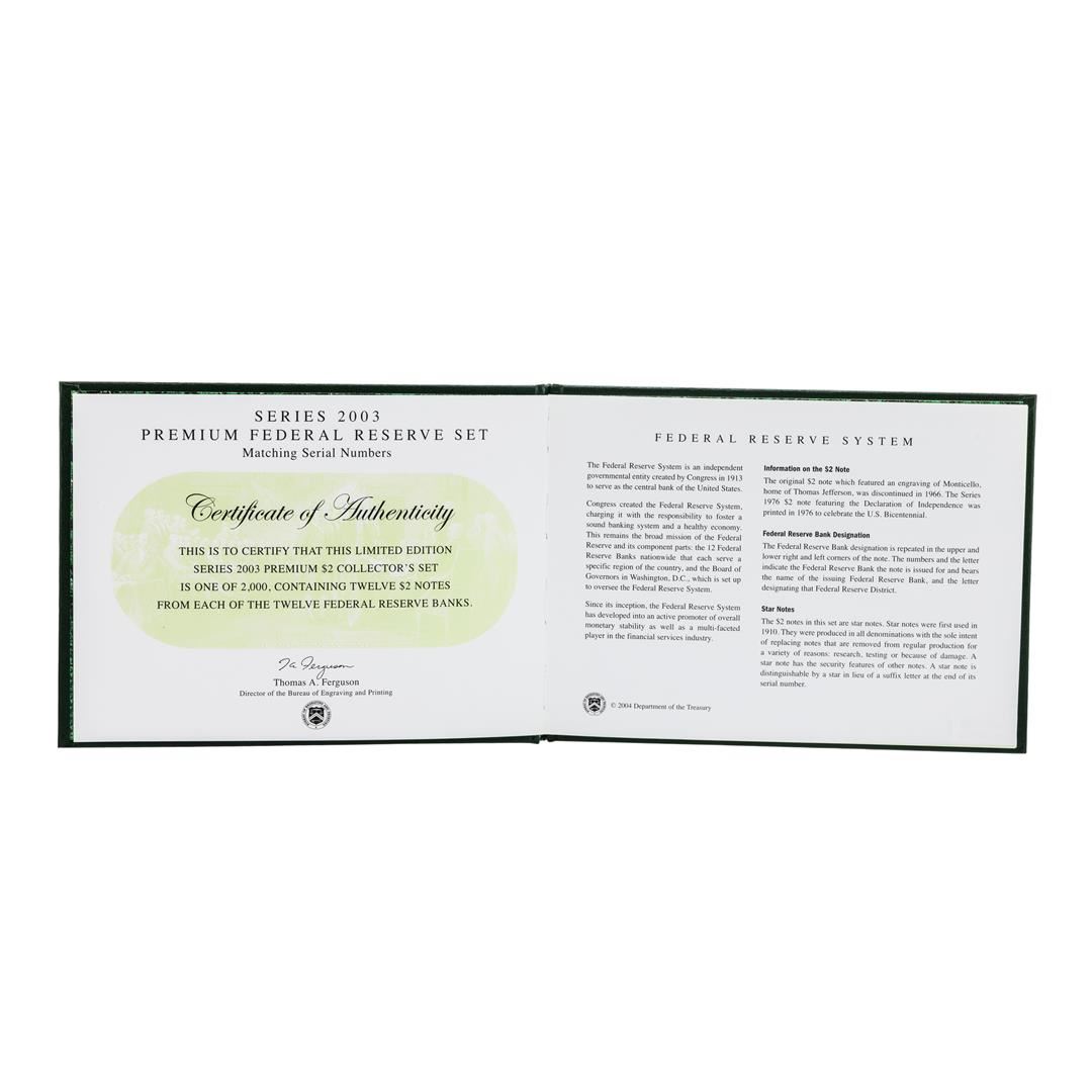 One Series 2003 $2 Premium Federal Reserve Set. Limited to only 2000 sets, and sold out within the first few hours, the 12-note matching 2003 $2 Premium Star Sets are considered a preeminent favorite of collectors.