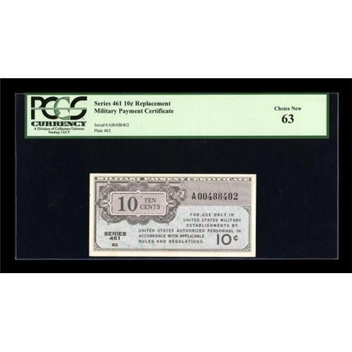 <B>Series 461 10c Replacement PCGS Choice New 63.</B></I> Schwan considers this note to be an R-4, and indicates nineteen pieces are known. This is a new number to the list, and it brings the total number of uncirculated examples known to seven. The Green Sheet does not value this Replacement above the 60 grade ($1100).<BR><I>From The Thomas M. Flynn Collection</B></I><BR><BR><b>Shipping:</b> Coins & Currency (<a target="_blank" href="http://www.heritageauctions.com/common/shipping.php">view shipping information</a>)