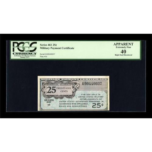 <B>Series 461 25c Replacement PCGS Apparent Extremely Fine 40.</B></I> In 1997, Schwan listed five known examples for this rare Replacement. This currently offered piece was not among them. The note is primarily quite attractive, although some minor discoloration at the right end of the face has caused PCGS to use an apparent holder and comment, "Right end discolored."<BR><I>From The Thomas M. Flynn Collection</B></I><BR><BR><b>Shipping:</b> Coins & Currency (<a target="_blank" href="http://www.heritageauctions.com/common/shipping.php">view shipping information</a>)
