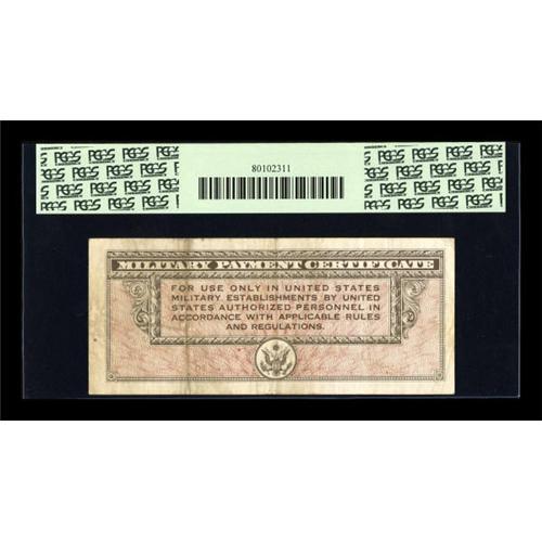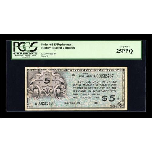 <B>Series 461 $5 Replacement PCGS Very Fine 25PPQ.</B></I> The 1997 Schwan book listed only seven examples of this Replacement, with this note among them. The Green Sheet does not list a price for this Five Dollar 461 Replacement above the Fine grade, which it values at $1100. This decent VF has the look of an XF from the face, with the back being slightly soiled. A highly important piece for the advanced MPC collector.<BR><I>From The Thomas M. Flynn Collection</B></I><BR><BR><b>Shipping:</b> Coins & Currency (<a target="_blank" href="http://www.heritageauctions.com/common/shipping.php">view shipping information</a>)