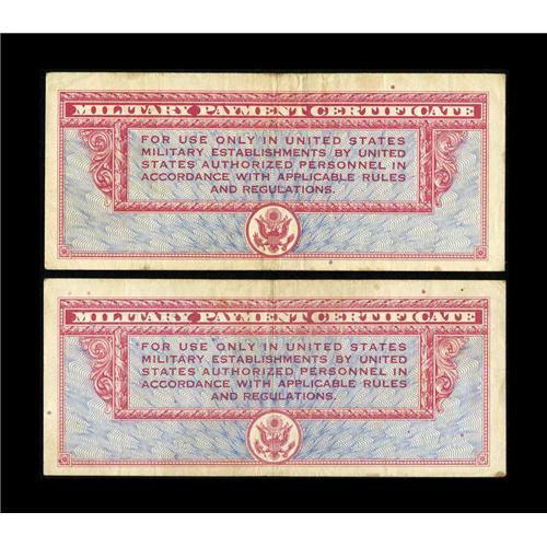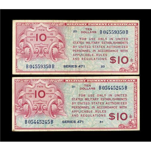 <B>Series 471 $10 Military Payment Certificates Two Examples.</B></I> One note grades <B>VF</B></I> and the second note grades <B>VF-XF</B></I> with a small spot in the lower left-hand corner tip.<BR><BR><b>Shipping:</b> Coin/Currency (<a target="_blank" href="http://www.heritageauctions.com/common/shipping.php">view shipping information</a>)