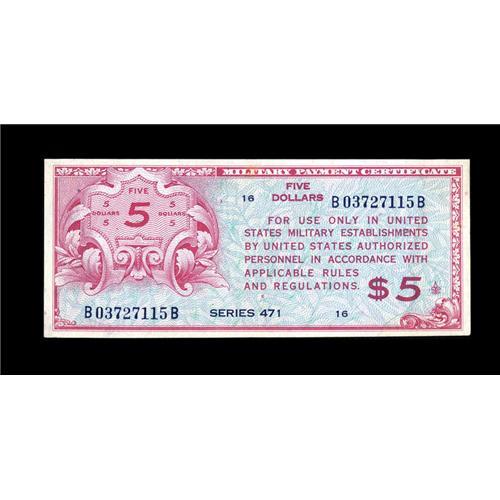 <B>Series 471 $5 About New.</B></I> This is one of the rarest MPCs in high grade. This $5 has a single center fold, a small paper disturbance at top center, and a couple of pinholes.<BR><BR><b>Shipping:</b> Coins & Currency (<a target="_blank" href="http://www.heritageauctions.com/common/shipping.php">view shipping information</a>)