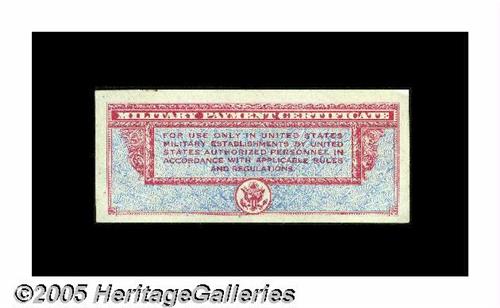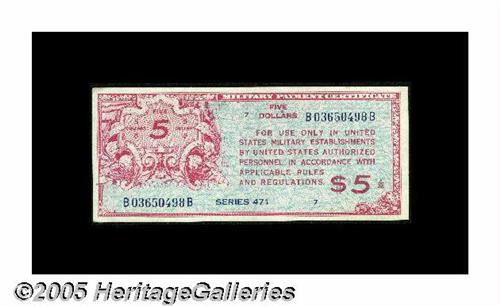 <B>Series 471 $5 About New.</B></I> This rare MPC $5 with vivid colors recently walked into a Southwest coin shop. It has a center bend and a small corner fold. Also, a trivial spot clings to the back top edge.