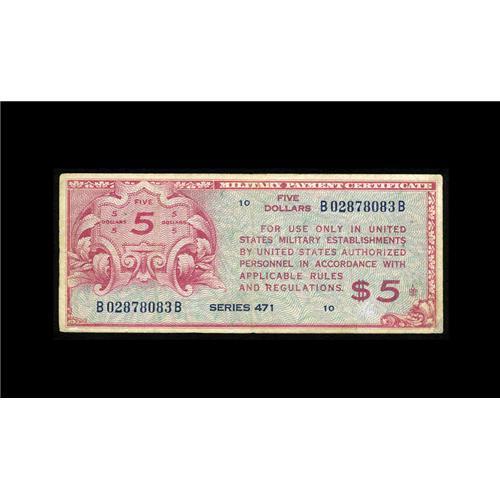 <B>Series 471 $5 Fine-Very Fine.</B></I> Scarce note that would grade higher if not for the repaired corner tip and hidden ink on face. <BR><BR><B>Important notice:<
