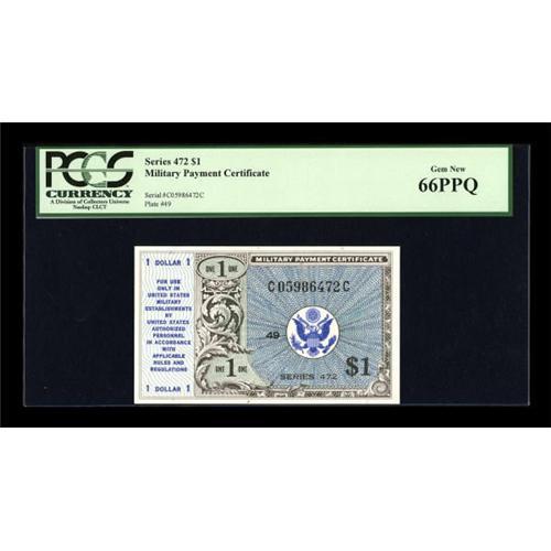 <B>Series 472 $1 PCGS Gem New 66PPQ.</B></I> Other than this lone PCGS 66PPQ, no other One Dollar of this series has been graded above 64 by either of the two major services. While we suspect that a few others may exist, it's a certainty that this note will always remain rare at this grade level.<BR><I>From The Thomas M. Flynn Collection</B></I><BR><BR><b>Shipping:</b> Coins & Currency (<a target="_blank" href="http://www.heritageauctions.com/common/shipping.php">view shipping information</a>)