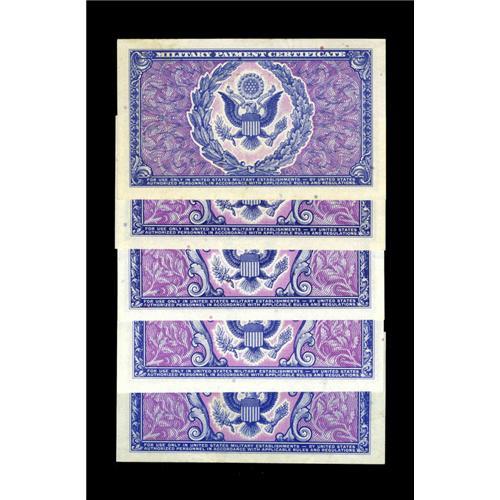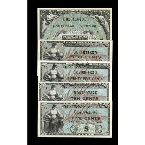 <B>Series 481 5¢, 10¢, 25¢, 50¢, $1.</B></I> The four Fractional denominations all grade <B>Gem New</B></I>; the $1 grades <B>Choice New</B></I> due to light paper aging. The 10¢, 25¢, and $1 are from the first printings; the 50¢ from the second printing; and the 5¢ is from the much scarcer fourth printing.