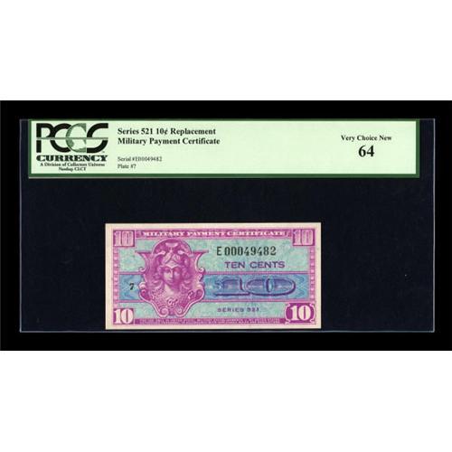 <B>Series 521 10c Replacement PCGS Very Choice New 64.</B></I> Schwan lists fourteen examples, not including this note, and only one of the fourteen is listed as uncirculated. This new-to-the-listing example is a beauty, with ideal paper and ink color, broad, even margins and tremendous eye appeal. Through the third-party holder, it has all the appearance of a Gem example. A lovely note, very rare at this grade level. The Green Sheet does not price this Replacement above AU ($1450).<BR><I>From The Thomas M. Flynn Collection</B></I><BR><BR><b>Shipping:</b> Coins & Currency (<a target="_blank" href="http://www.heritageauctions.com/common/shipping.php">view shipping information</a>)
