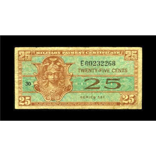 <B>Series 521 25¢ Replacement Very Good-Fine.</B></I> This recently surfaced replacement is from the first printing where Schwan documents only seven serial numbers.<BR><BR><b>Shipping:</b> Coin/Currency (<a target="_blank" href="http://www.heritageauctions.com/common/shipping.php">view shipping information</a>)