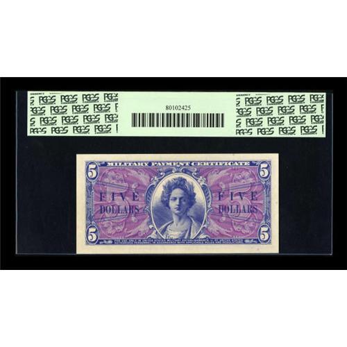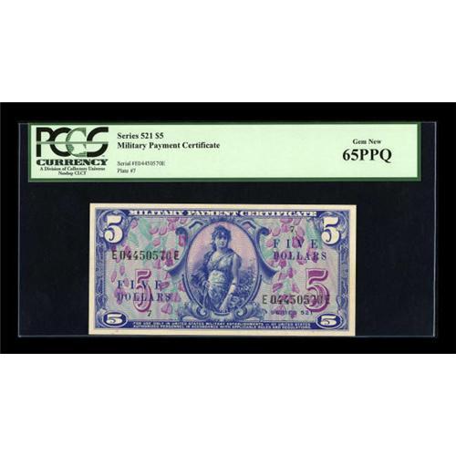 <B>Series 521 $5 PCGS Gem New 65PPQ.</B></I> To date, this is the highest certified 521 Five Dollar by PCGS, and the only one at its grade level. It's one of the scarcest MPC notes to find in Gem condition. The ink colors are perfect, the margins broad and even, and the original paper embossing can be easily seen through the third-party holder.<BR><I>From The Thomas M. Flynn Collection</B></I><BR><BR><b>Shipping:</b> Coins & Currency (<a target="_blank" href="http://www.heritageauctions.com/common/shipping.php">view shipping information</a>)