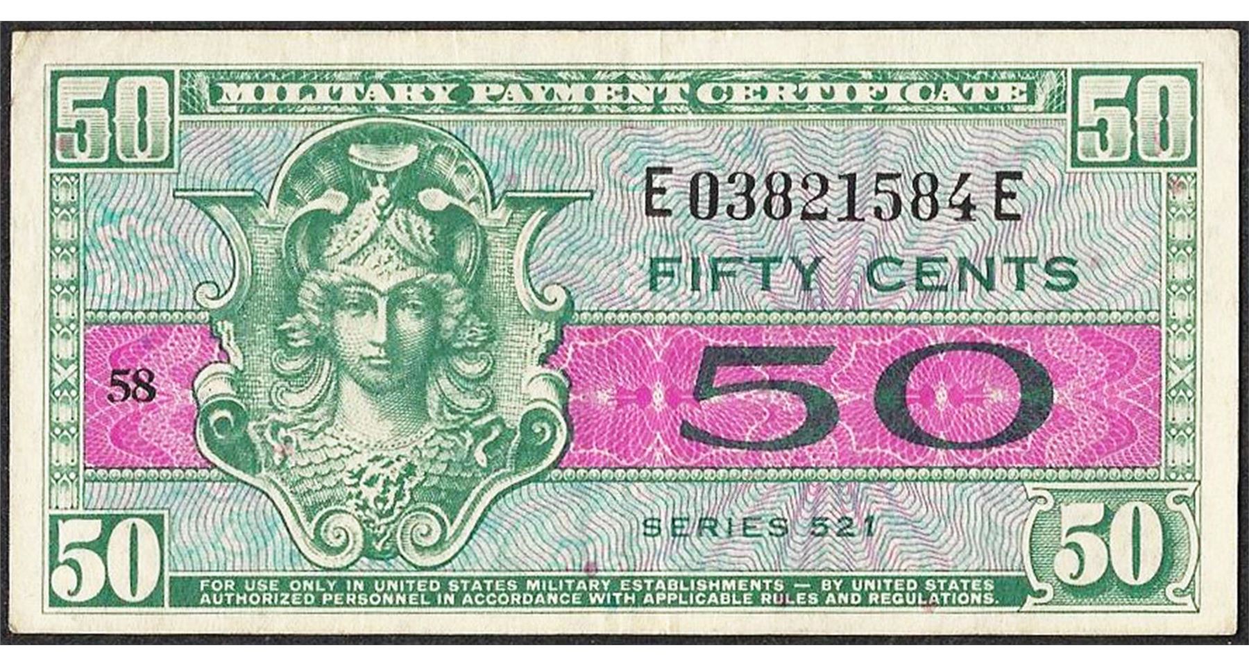 One Series 521 Fifty Cents Military Payment Certificate Note.