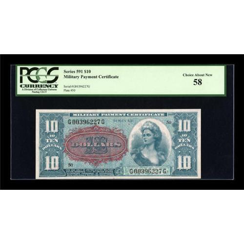 <B>Series 591 $10 PCGS Choice About New 58.</B></I> A relatively scarce note in all grades. This Choice About New example must have a light fold somewhere, but we sure can't find it through the third-party holder. It has the margins, color and overall appearance of a Gem example.<BR><I>From The Thomas M. Flynn Collection</B></I><BR><BR><b>Shipping:</b> Coins & Currency (<a target="_blank" href="http://www.heritageauctions.com/common/shipping.php">view shipping information</a>)