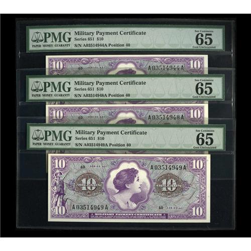 <B>Series 651 $10 Two Consecutive Examples PMG Gem Uncirculated 65 EPQ.</B></I> Just a little more margin propels this pair to a higher grade level.<BR><BR><b>Shipping:</b> Coin/Currency (<a target="_blank" href="http://www.heritageauctions.com/common/shipping.php">view shipping information</a>)