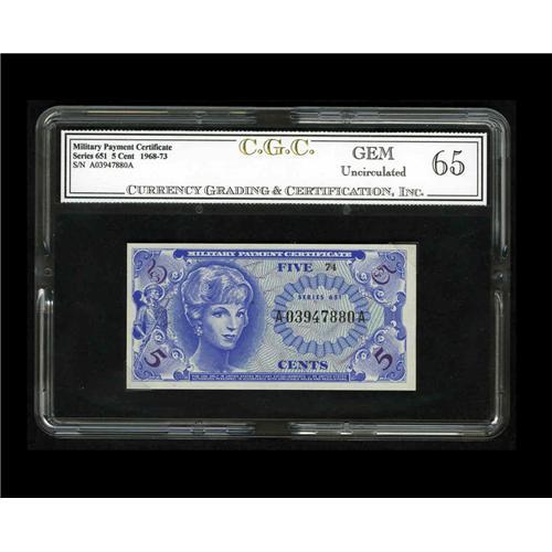 <B>Series 651 5¢ CGC Gem Uncirculated 65.</B></I> A broadly margined, handsome example of the lowest denomination note from this series.