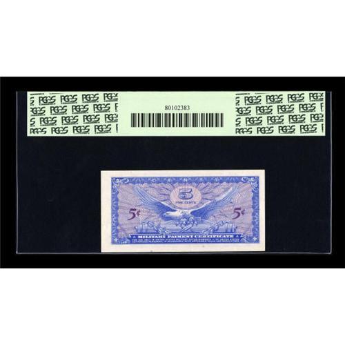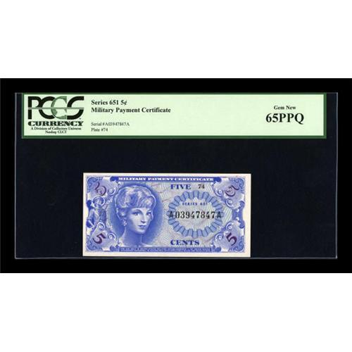 <B>Series 651 5c PCGS Gem New 65PPQ.</B></I> The Fractional denominations of this issue were unknown for many years until a small hoard was located. Values have been speculative, with the early pieces bringing four-figure prices. They've settled out a bit more recently, and have begun to rise from their lowest levels.<BR><I>From The Thomas M. Flynn Collection</B></I><BR><BR><b>Shipping:</b> Coins & Currency (<a target="_blank" href="http://www.heritageauctions.com/common/shipping.php">view shipping information</a>)