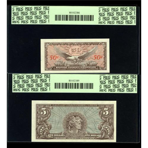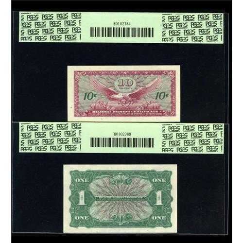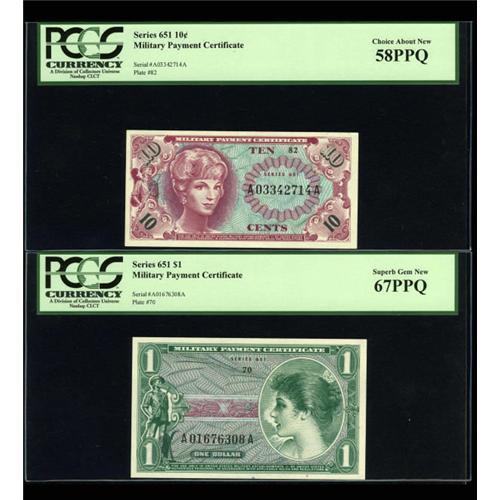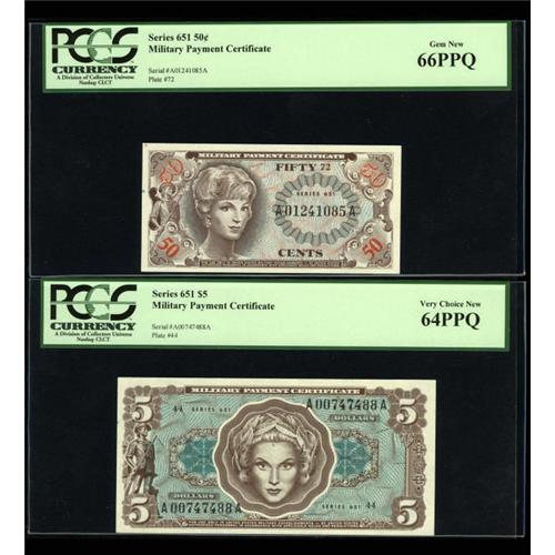 <B>Series 651 Notes.</B></I> The <B>Ten Cent Series 651 </B></I>grades<B> PCGS 58PPQ</B></I>, the 50c is a high-end Gem grading <B>PCGS 66PPQ</B></I>, the One Dollar is Superb, grading <B>PCGS</B></I> <B>67PPQ</B></I>, and the Five Dollar is just shy of Gem, grading <B>64PPQ</B></I>.<BR><I>From The Thomas M. Flynn Collection</B></I><BR><BR><b>Shipping:</b> Coins & Currency (<a target="_blank" href="http://www.heritageauctions.com/common/shipping.php">view shipping information</a>)