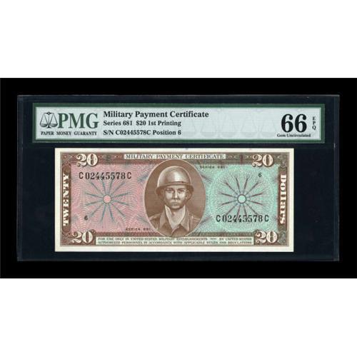 <B>Series 681 $20 First Printing PMG Gem Uncirculated 66 EPQ.</B></I> The colors remain bold and the margins are ample for a Superb grade.<BR><BR><BR><b>Shipping:</b> Coins & Currency (<a target="_blank" href="http://www.heritageauctions.com/common/shipping.php">view shipping information</a>)