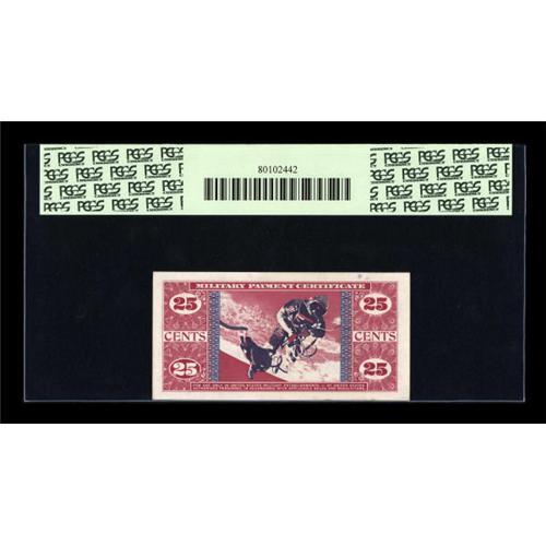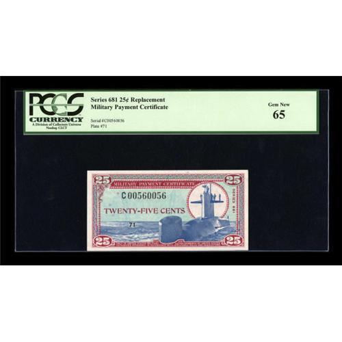 <B>Series 681 25c Replacement PCGS Gem New 65.</B></I> This is a lovely example of an extremely rare Replacement note. Surprisingly, the Twenty Five Cent is the rarest denomination by far for Series 681 Replacements. Only five pieces are listed in Schwan, including this note. The second-rarest denomination is the Five Dollar, with eleven examples known. Although listed as an AU, this is still the highest-graded example in Schwan. This 25c Replacement note is the only denomination from the 681 series that is unpriced on the Green Sheet in any grade.<BR><I>From The Thomas M. Flynn Collection</B></I><BR><BR><b>Shipping:</b> Coins & Currency (<a target="_blank" href="http://www.heritageauctions.com/common/shipping.php">view shipping information</a>)