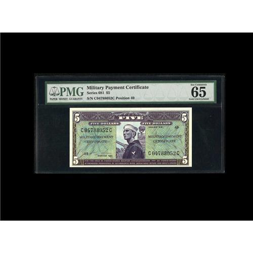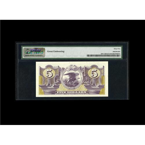 <B>Series 681 $5 PMG Gem Uncirculated 65.</B></I> This colorful example has the additional comment "Great Embossing" on the holder. Were the bottom margin a touch bigger, this issue would have certainly been Superb Gem.
