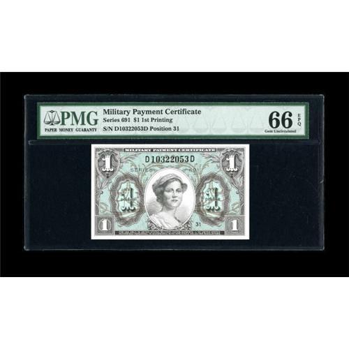 <B>Series 691 $1 PMG Gem Uncirculated 66 EPQ</B></I>. This is a gorgeous first printing example from this most attractive, unissued Vietnam Era series. The Five Dollar denomination is proving to be the second scarcest of the four denominations known for this series.<BR><BR><b>Shipping:</b> Coins & Currency (<a target="_blank" href="http://www.heritageauctions.com/common/shipping.php">view shipping information</a>)