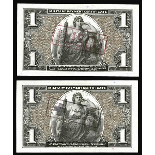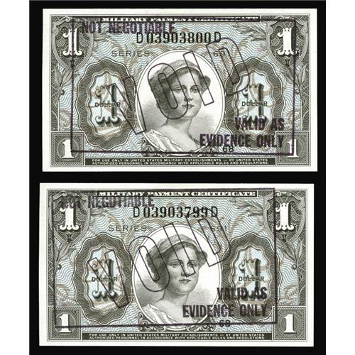 <B>Series 691 $1 "VOID" Two consecutive Examples. Superb Gem New.</B></I> These notes are stamped, "NOT NEGOTIABLE" - "VOID" - "VALID AS EVIDENCE ONLY" on the face. One on the back has an "American Red Cross" stamping, while the other has a "USO" stamping. These were originally acquired by donations made to these organizations through the contact for the release of Series 691.
