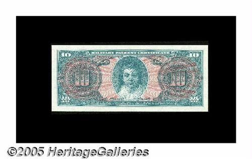 <B>Series 691 $10 Gem New.</B></I> The $5 and $10 from this recently discovered unissued series are the two scarcest denominations. The green and red colors in which this denomination was printed make an especially striking overall appearance.
