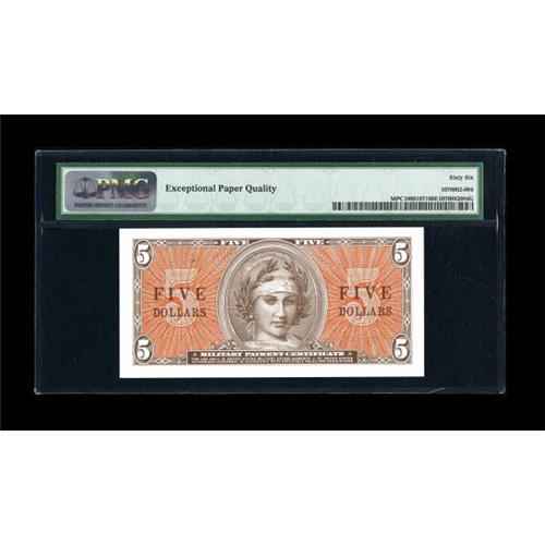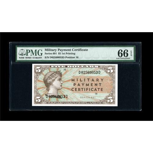 <B>Series 691 $5 PMG Gem Uncirculated 66 EPQ</B></I>. Near perfect margins highlight this scarce non-issued Vietnam era note.<BR><BR><b>Shipping:</b> Coins & Currency (<a target="_blank" href="http://www.heritageauctions.com/common/shipping.php">view shipping information</a>)