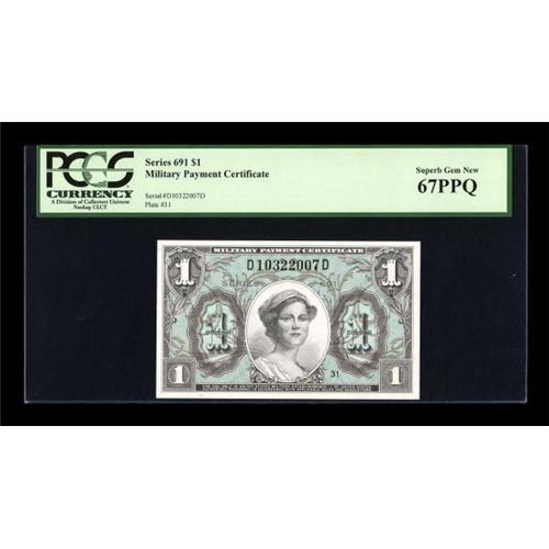 <B>Series 691 $1 PCGS Superb Gem New 67PPQ.</B></I> A Superb example of the second-most common denomination from this very scarce recently discovered series.<BR><I>From The Thomas M. Flynn Collection</B></I><BR><BR><b>Shipping:</b> Coins & Currency (<a target="_blank" href="http://www.heritageauctions.com/common/shipping.php">view shipping information</a>)