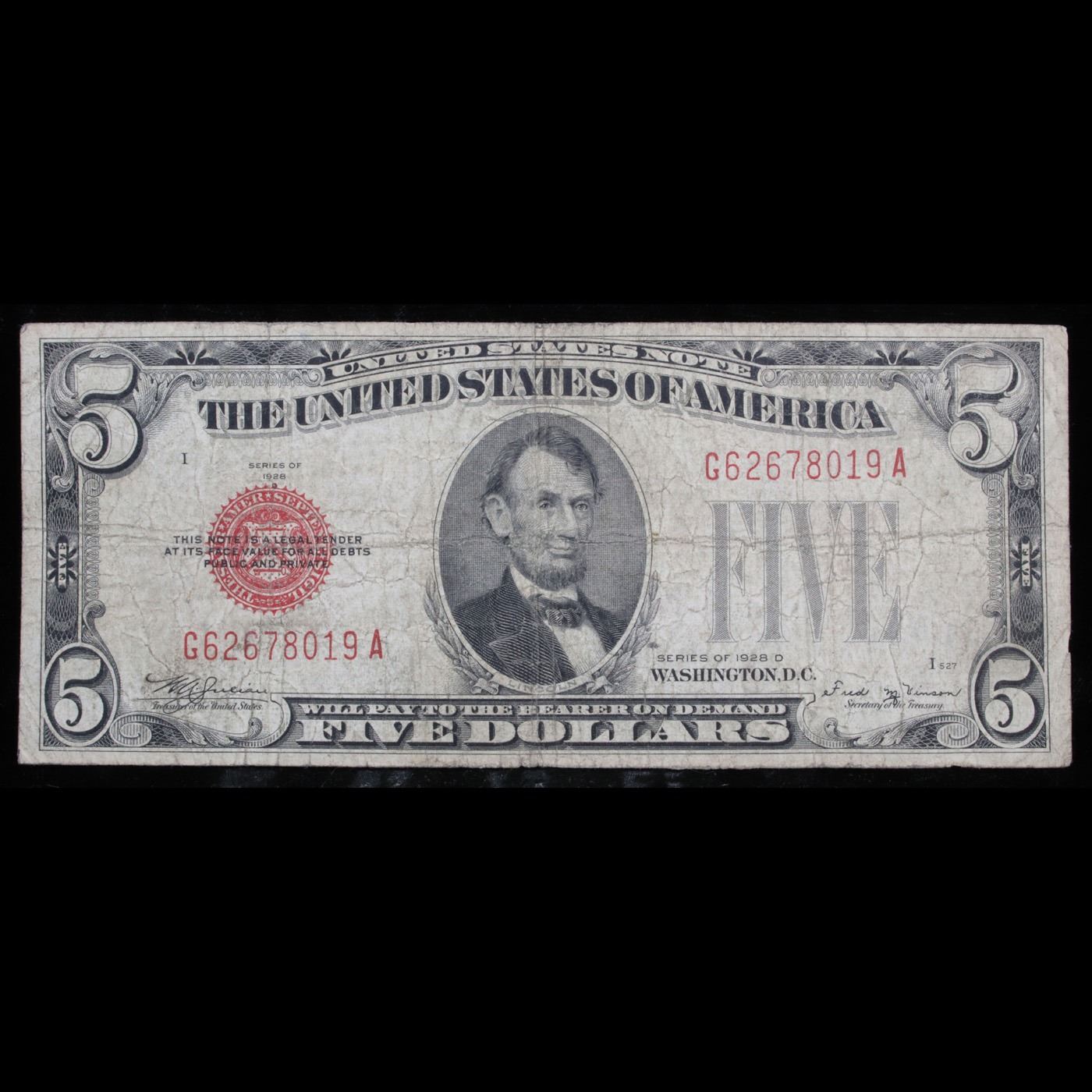 Series of 1928D $5 Red Seal United States Note Key to the Series Grades f+. The Series of 1928D red seal five dollar bill is the key to the regular issue 1928 five dollar legal tender series. The series of 1928D five dollar Federal Reserve note is a bill that should be on everyone’s watch list. These are fairly easy to spot and are quite rare. Series of 1928D Red seal five dollar bills were signed by W.A. Julian as the Treasurer of The United States and by Fred M. Vinson as the Secretary of the Treasury. Based on serial number ranges we know that about 9 million series of 1928D Red seal five dollar bills were printed Out of the 900 Million Series of 1928 $5 red Seal Bills Printed. All of these notes were printed for the Atlanta district.
