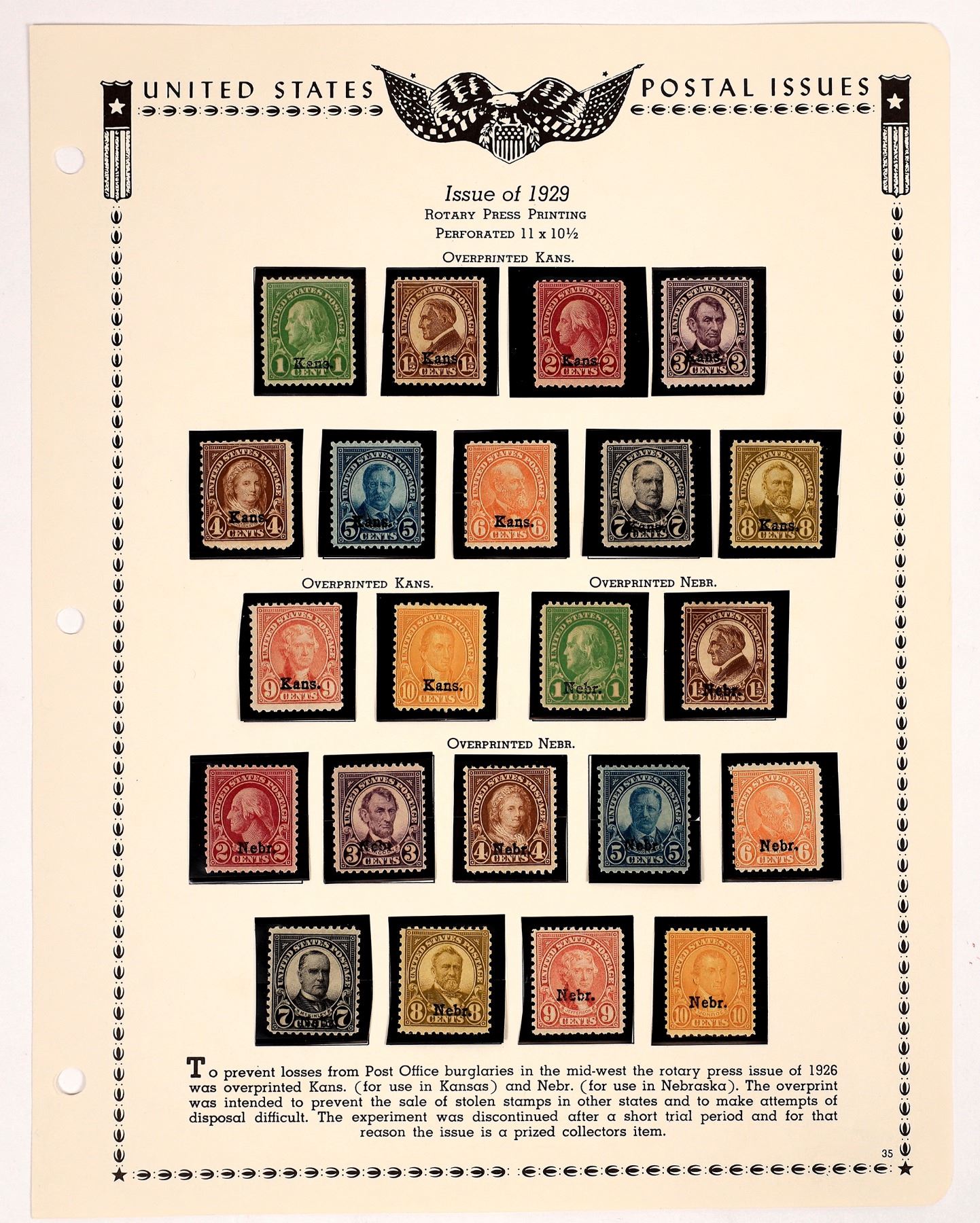 22 series of 1929 Kansas and Nebraska mint overprinted stamps. 1c to 10c, on album page.