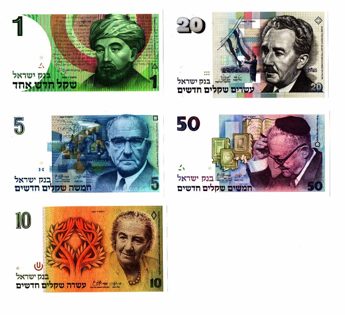 Series of 5 Israel Bank notes, New Shekel in the amounts of 1, 5, 10, 20, and 50 New Shekels, 1986-7, conditions XF-AU.