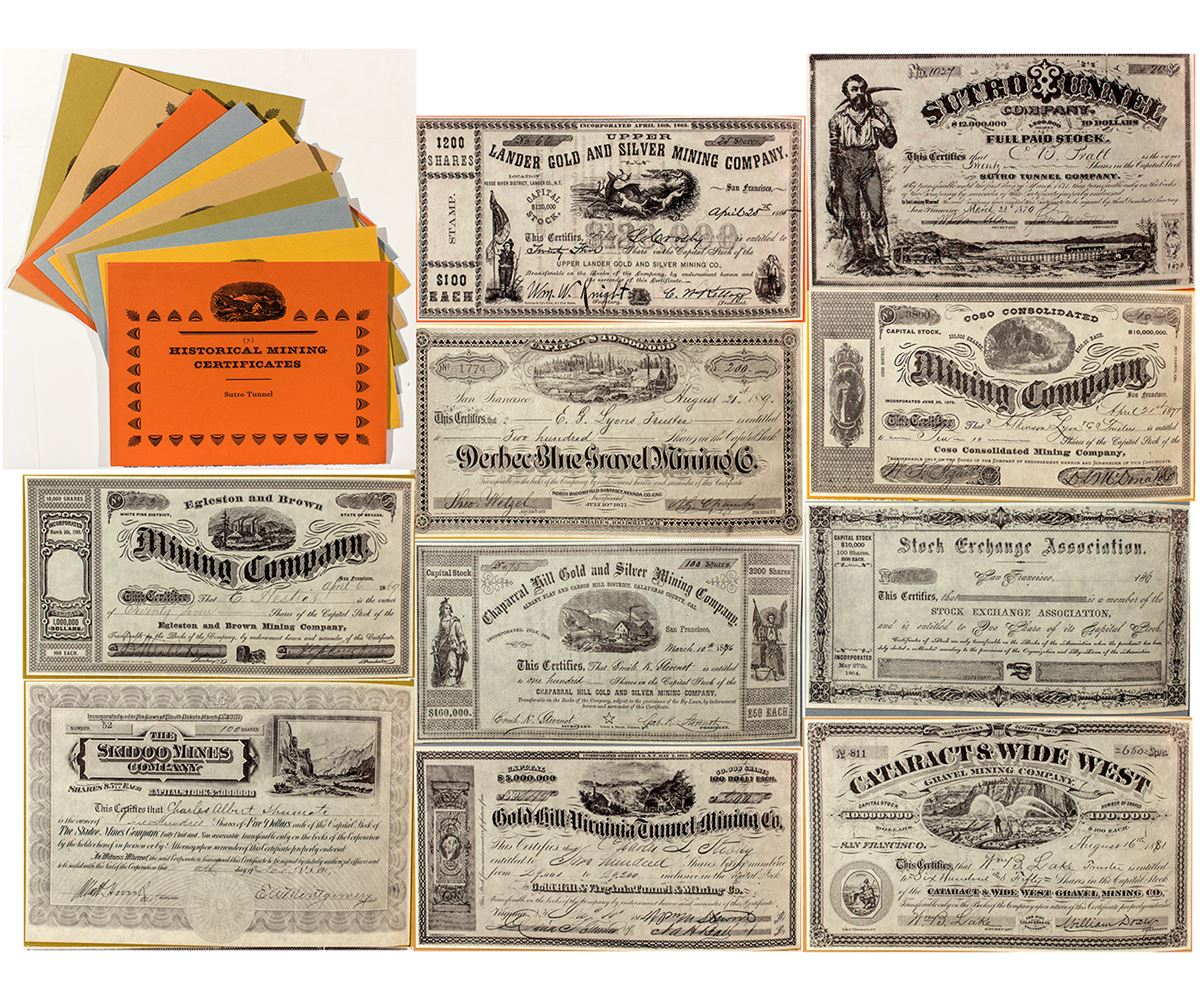 This ten item series features descriptions and reproductions of mining stock certificates. The series was issued by The Book Club of California in 1971, printed by the Ward Ritchie Press. Includes: Egleston and Brown Mining Co. (Treasure Hill), Upper Lander G&S Mining Co., Derbec Blue Gravel Mining Co., Gold Hill and Virginia Tunnel and Mining Co., Skidoo Mines Co., Sutro Tunnel, Coso Cons. Mining Co., Stock Exchange Assoc. and Cataract and Wide West Mining Co. Excellent condition.