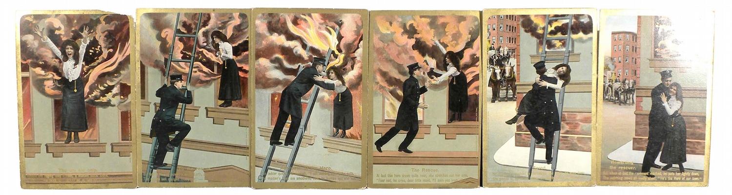 Series of Six Fire Postcards. The E.L. Theochrom Series No. 1167, Printed in Germany. The set includes The Cry for Help, To the rescue, Approach of the Hero, The Rescue, Saved and Rewarding the rescuer. First postcard has paper loss in top right corner all others are in very good condition.