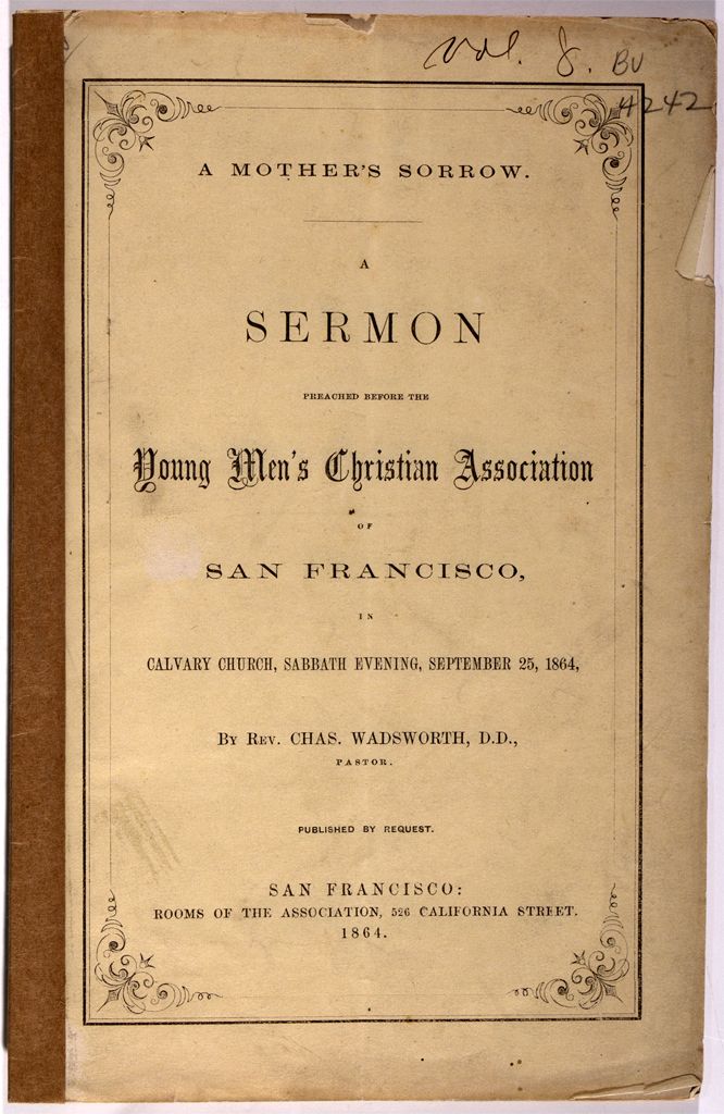 “A Mother’s Sorrow". A sermon preached before the Young Men’s Christian Association of San Francisco in Calvary Church, Sabbath Evening September 25, 1864. By Rev. Chas. Wadsworth, D.D. Pastor” Published at the Request of San Francisco: rooms of the Association. 526 California Street. This sermon is a response to the temptations young men face in the wicked city. Some wear including tears. Measures 5.9" x 9." -58795