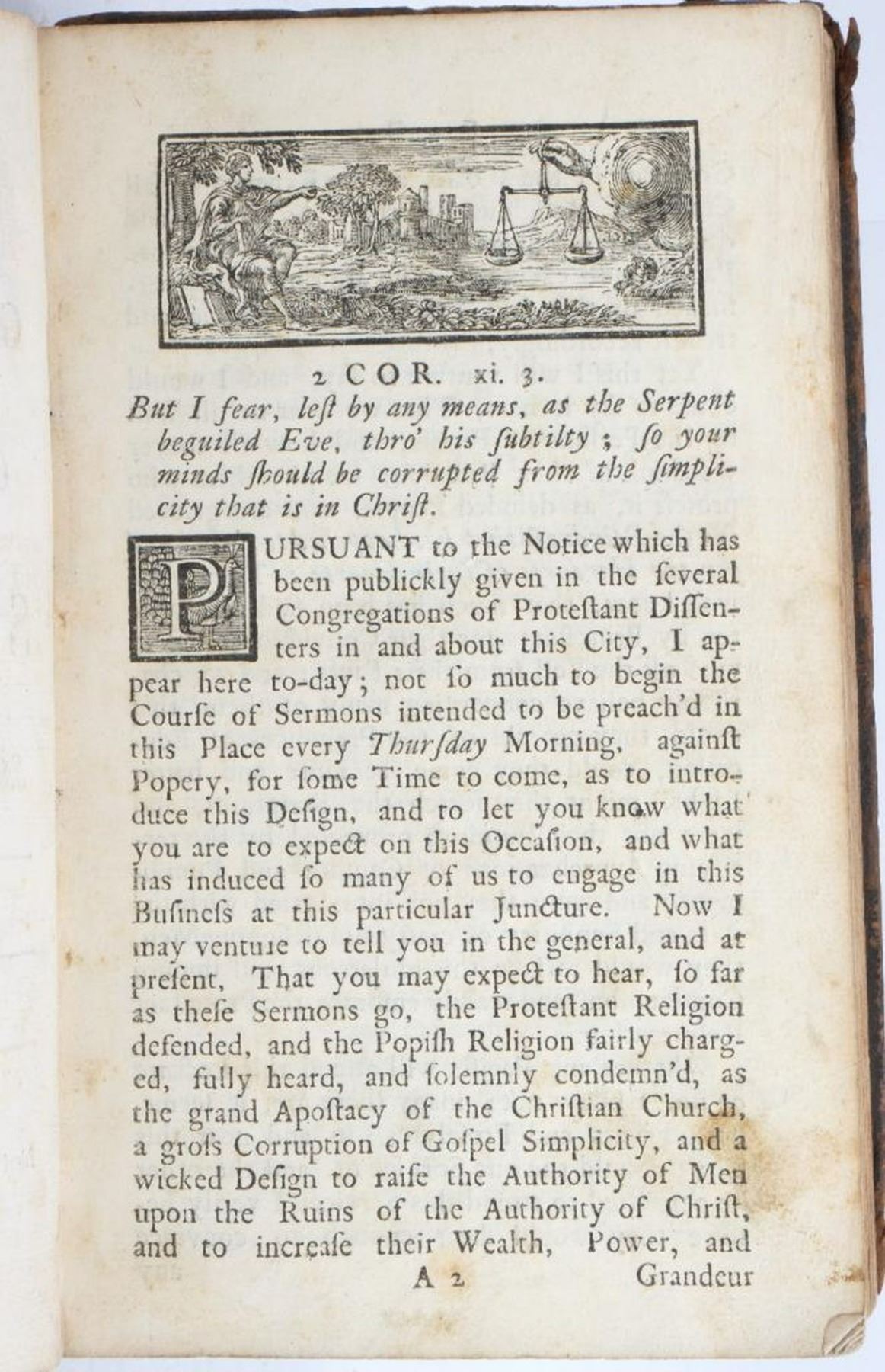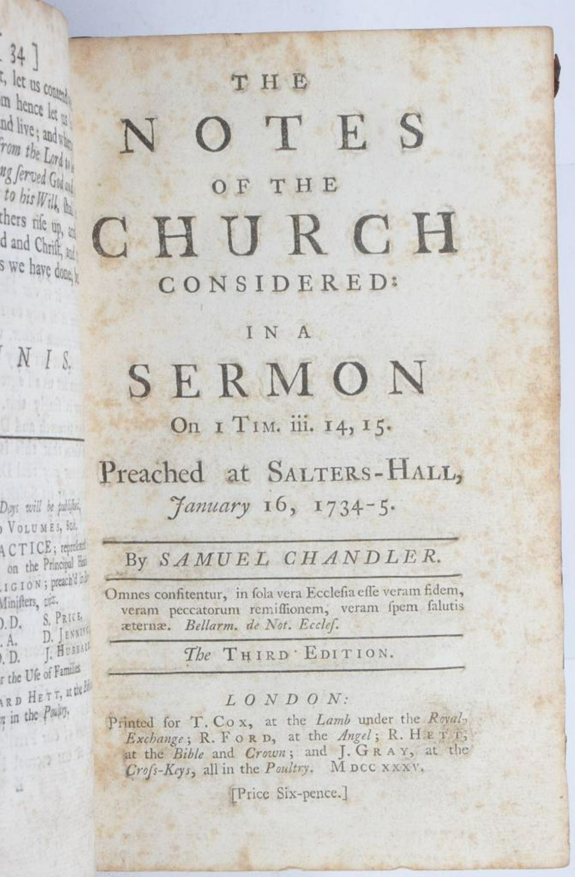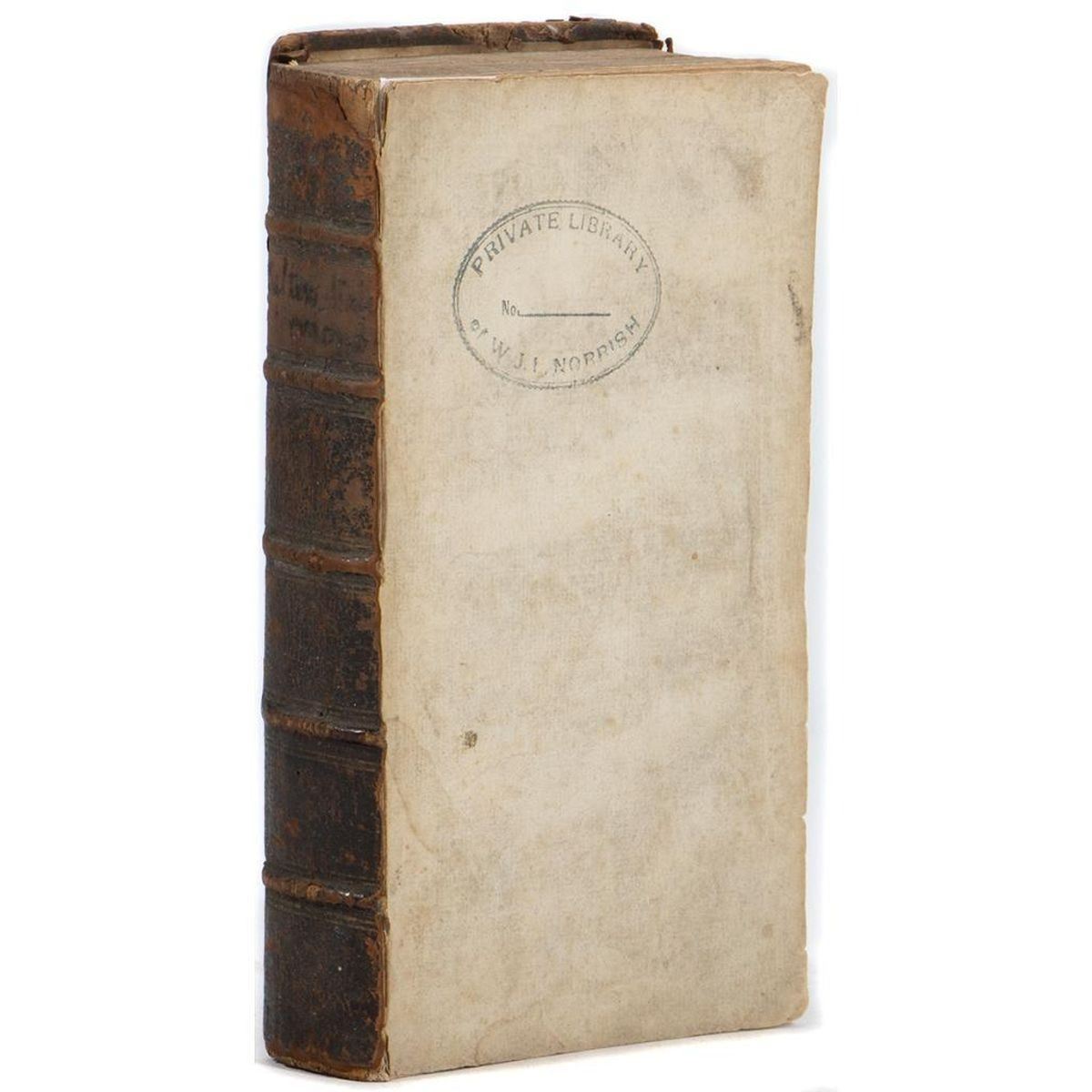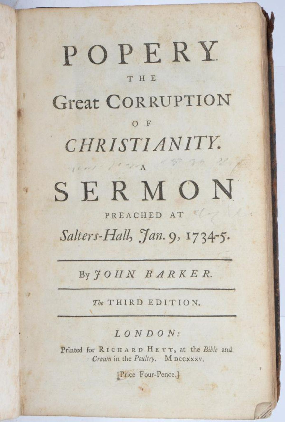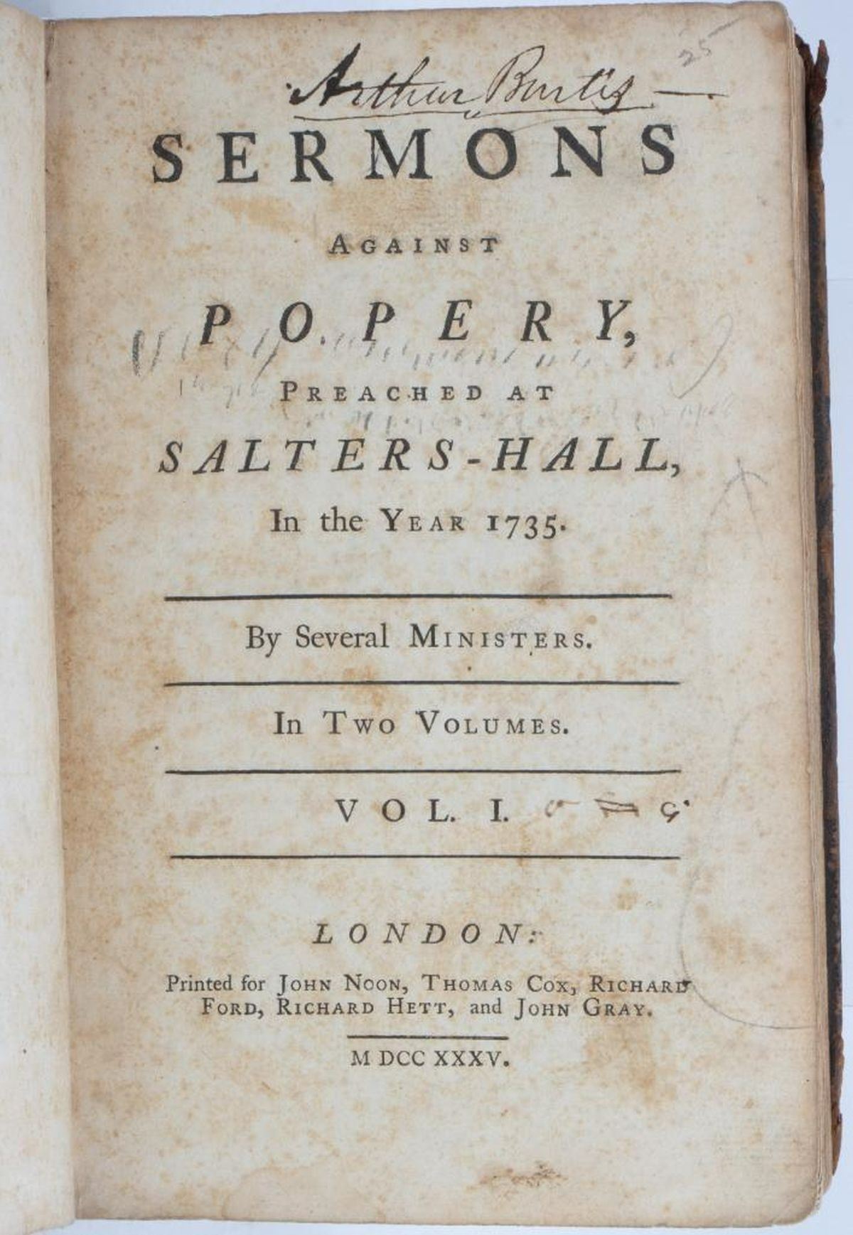 SERMONS AGAINST POPERY, PREACHED AT SALTERS-HALL, IN THE YEAR 1735. By Several Ministers. In Two Volumes [of which this is Vol. I only]. London: Printed for John Noon, Thomas Cox, Richard Ford, Richard Hett, and John Gray, 1735. 12mo (7 5/8" x 5"). Brown leather, raised bands on spine. Seven sermons are included in this volume, by John Barker, Samuel Chandler, Daniel Neal, George Smith, Samuel Wright, W. Harris, Condition: Poor; the front cover is detached and not present; gilt is worn from the spine, losses of leather at ends of spine, spine label missing; back cover partially detached and allover worn/scratched, boards showing. Ex libris stamp and old owner's inscription on title page.There is scattered old marginalia/lines and notes at back; one engraved page header and decorative initial colored in with red by a previous owner, and in at least one other area. Pages are soiled to varying degrees, toning/foxing (considerable in some sections), several spots of dampstain, a number of small tears at edges.