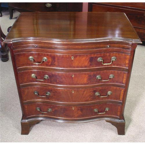 Fine quality mahogany serpentine chest with 'brushing' slide. English made c.1920 with brass 'swan-neck' handles.