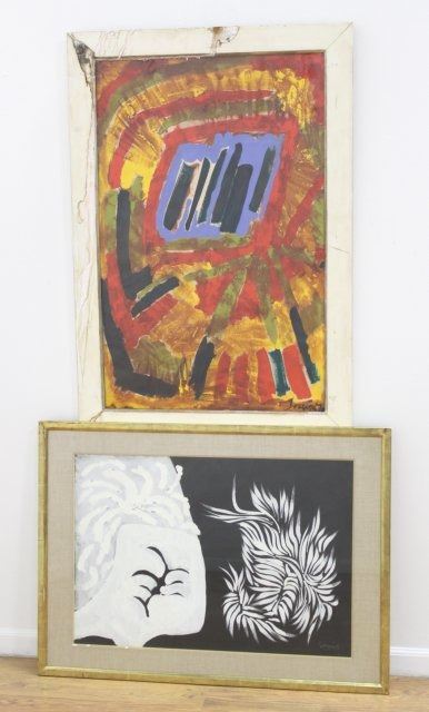 Oil on paper. One signed and dated 1968, approx. 22" H x 32" W without frame, 29" H x 39" W framed. One signed and dated 1970, approx. 39" H x 25" W unframed, 45" H x 37" W framed. (49, 50) 1968 with paint loss left side. 1970 with damages to frame.