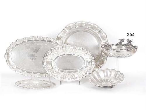 Silver, round form, impressed border with doves, circa 1900, Diana mark, weight: 323.0 g, diameter: 20 cm, damaged.