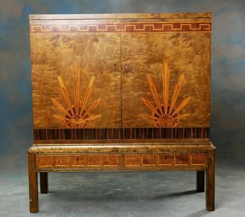 Serveringsskåp björk med intarsia i olika träslag 1920-30-tal H 152 L 144 D 52 mindre fanérskador