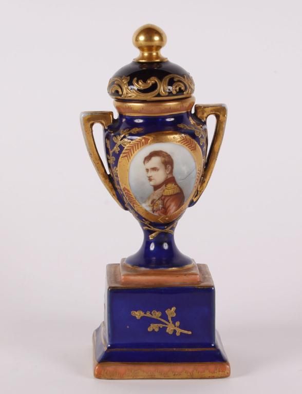 Cobalt base with gilt details, all hand painted with medallion, a portrait of a soldier on one side, stamped on base Austria Victoria Carlsbad, measures 6 1/2"x21/2", in near fine condition.