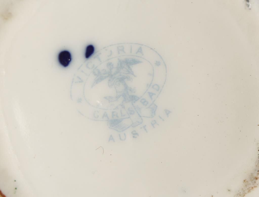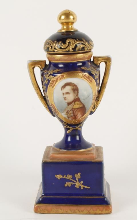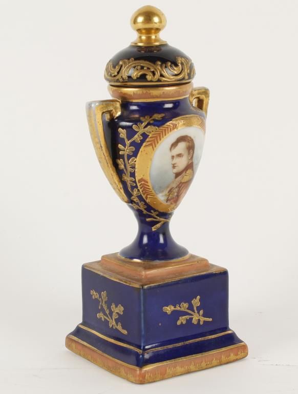 Cobalt base with gilt details, all hand painted with medallion, a portrait of Napoleon Bonaparte on one side, stamped on base Austria Victoria Carlsbad, measures 6 1/2"x21/2", in near fine condition.