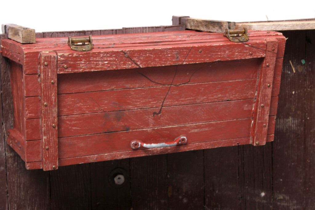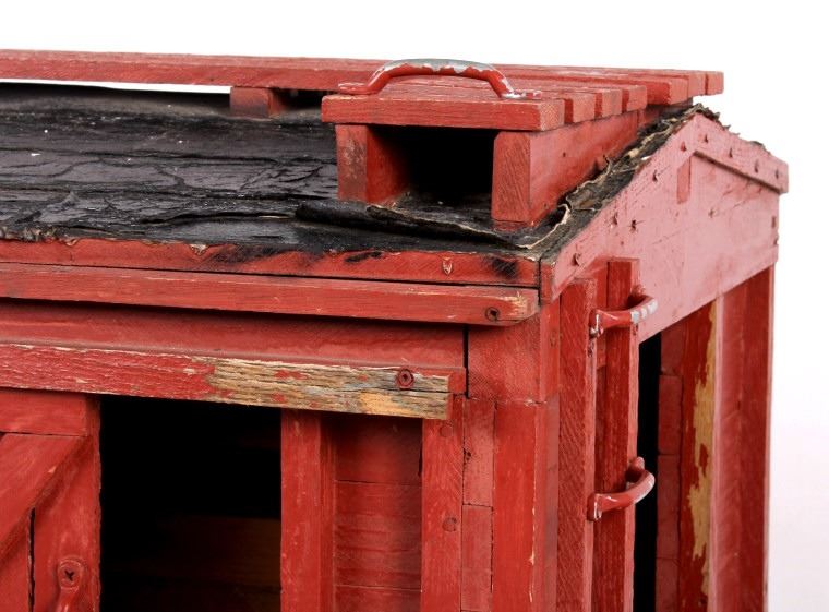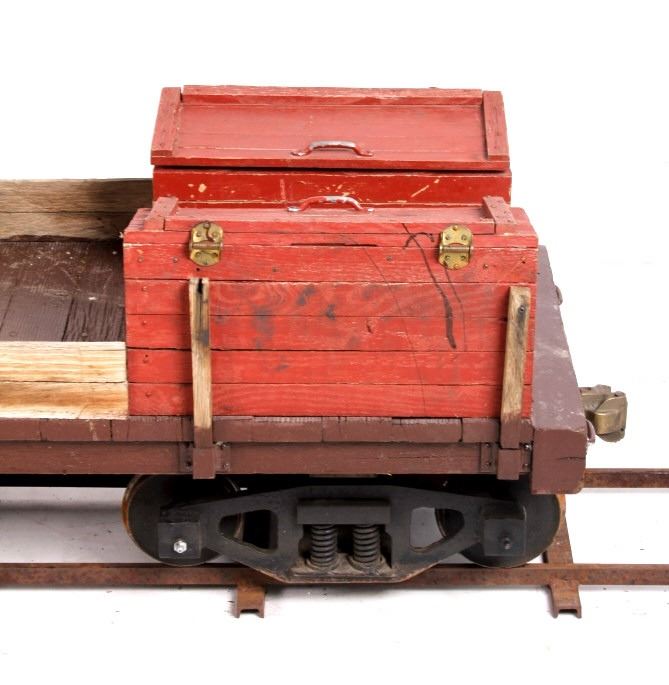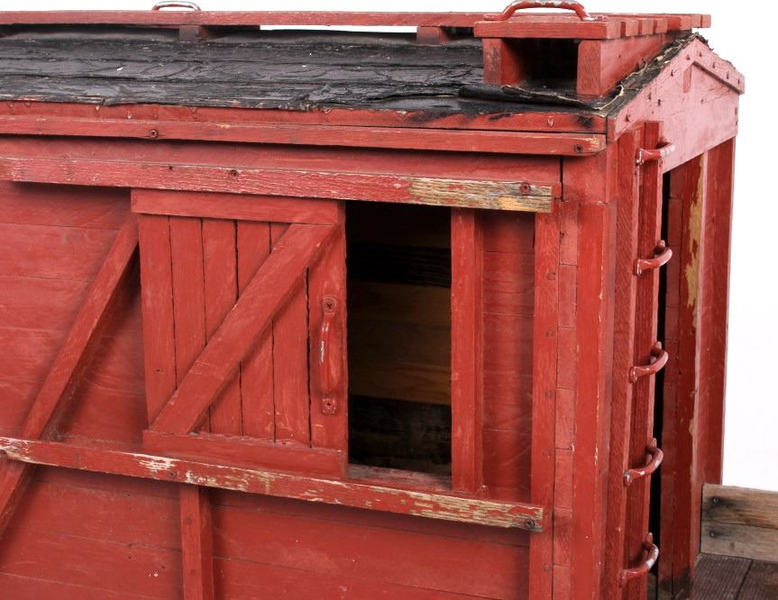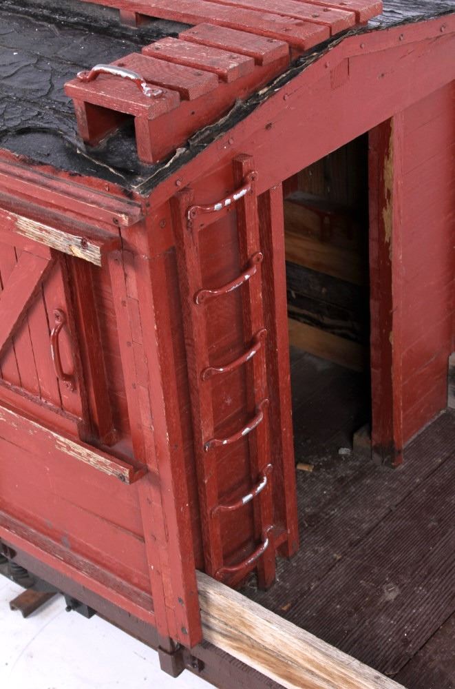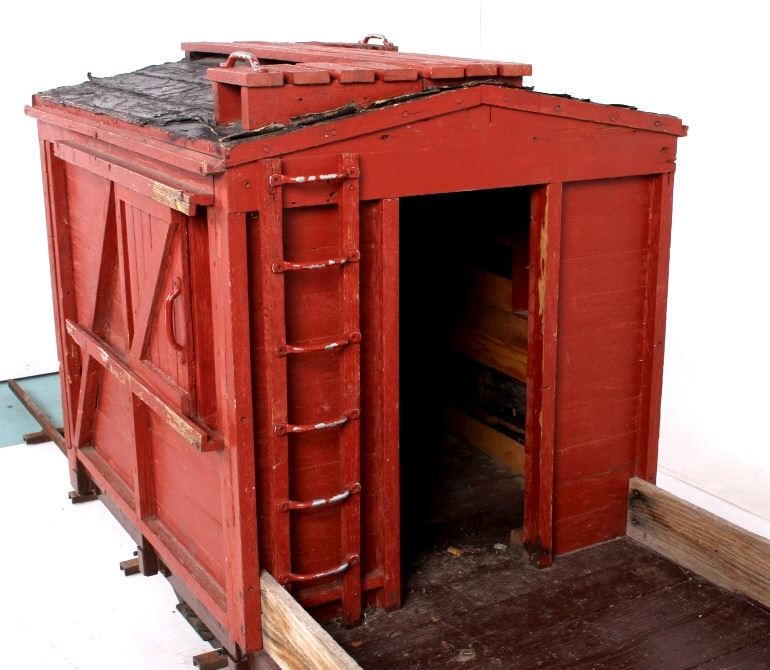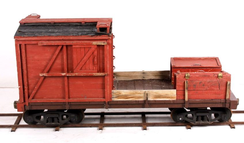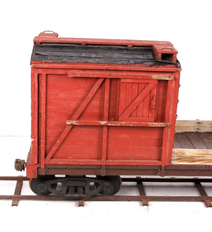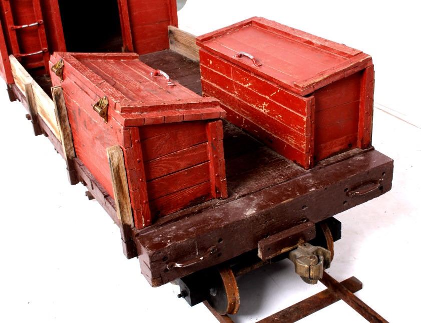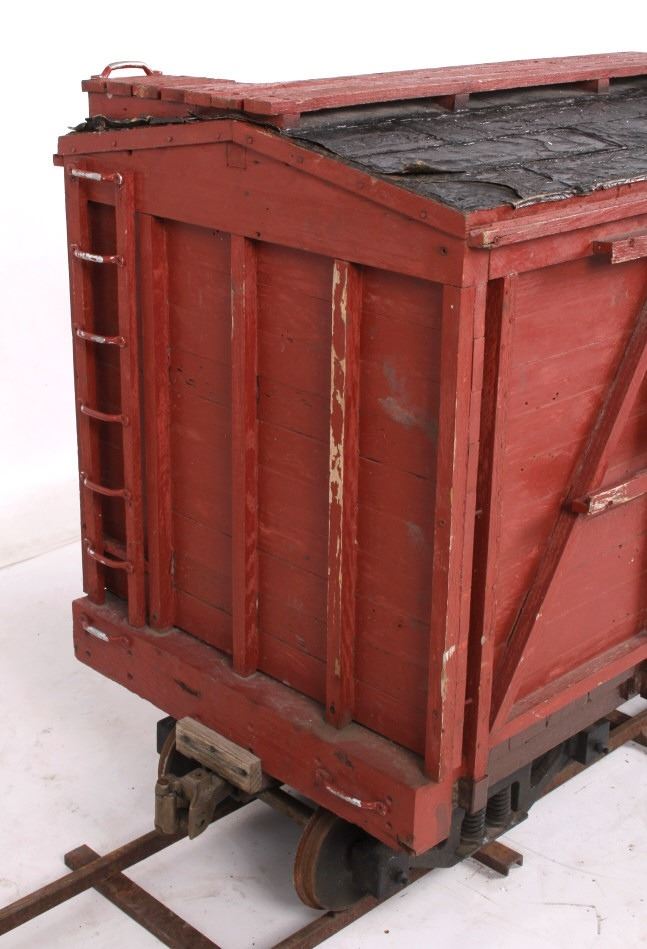 This is a 7.5" gauge live steam service boxcar. The boxcar came from the James Edgerley collection of the OR&W Railroad in Bozeman, Montana. The car is made from wood. The covered portion features sliding doors, one on each side. In addition, there are two boxes with hinged lids that open for storage space. The service boxcar is in good condition. It measures 64" long, 18" wide and 28.5" tall.
