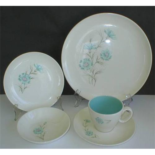 This is such a sweet and retro pattern by Taylor Smith & Taylor called Boutonniere with turquoise blue carnations in excellent condition with no chips or cracks. The set consists of six 5 piece place settings including Dinner Plates, Berry Dessert Bowls, Dessert Plates, Teacups and Saucers. The teacups have a turquoise blue interior giving them that extra special touch and all pieces have that wonderful retro 50's design and would make a great addition to any 50's style kitchen or dining room decor! All pieces are in excellent condition, a couple of the dinner plates have very slight yellowing around the edges but this does not detract in any way as it actually looks good and adds to their vintage charm. I'm sure this can be removed with some sort of cleaners but I will leave that up to the buyer as this does not detract in any way. A must have for your vintage retro decor!
