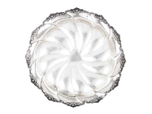 Silver, 1059 g. Lobed bowl divided into twelve parts with cast roses on the rim. Marked: Hungarian, circa 1940. Size: 37 x 6.5 cm