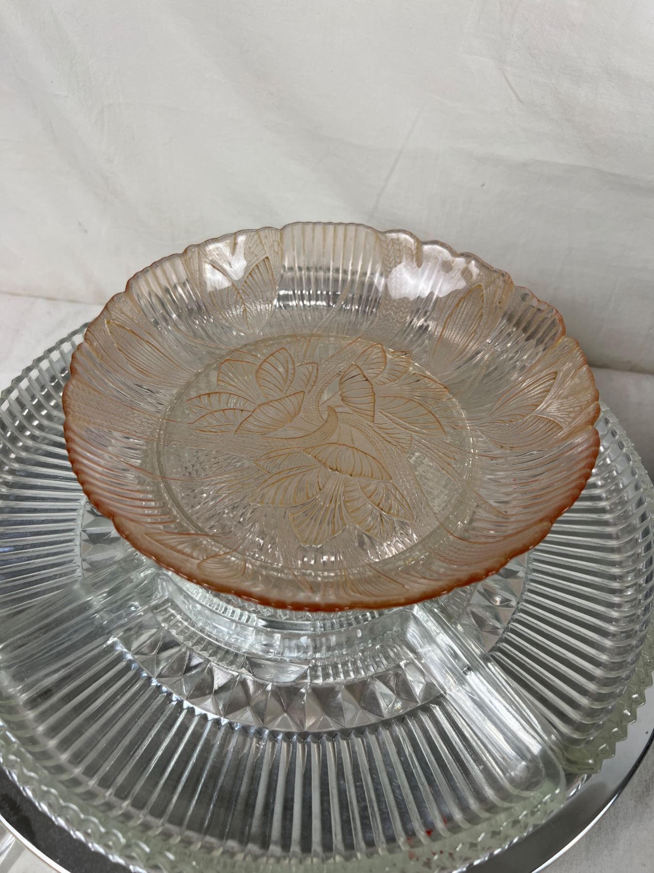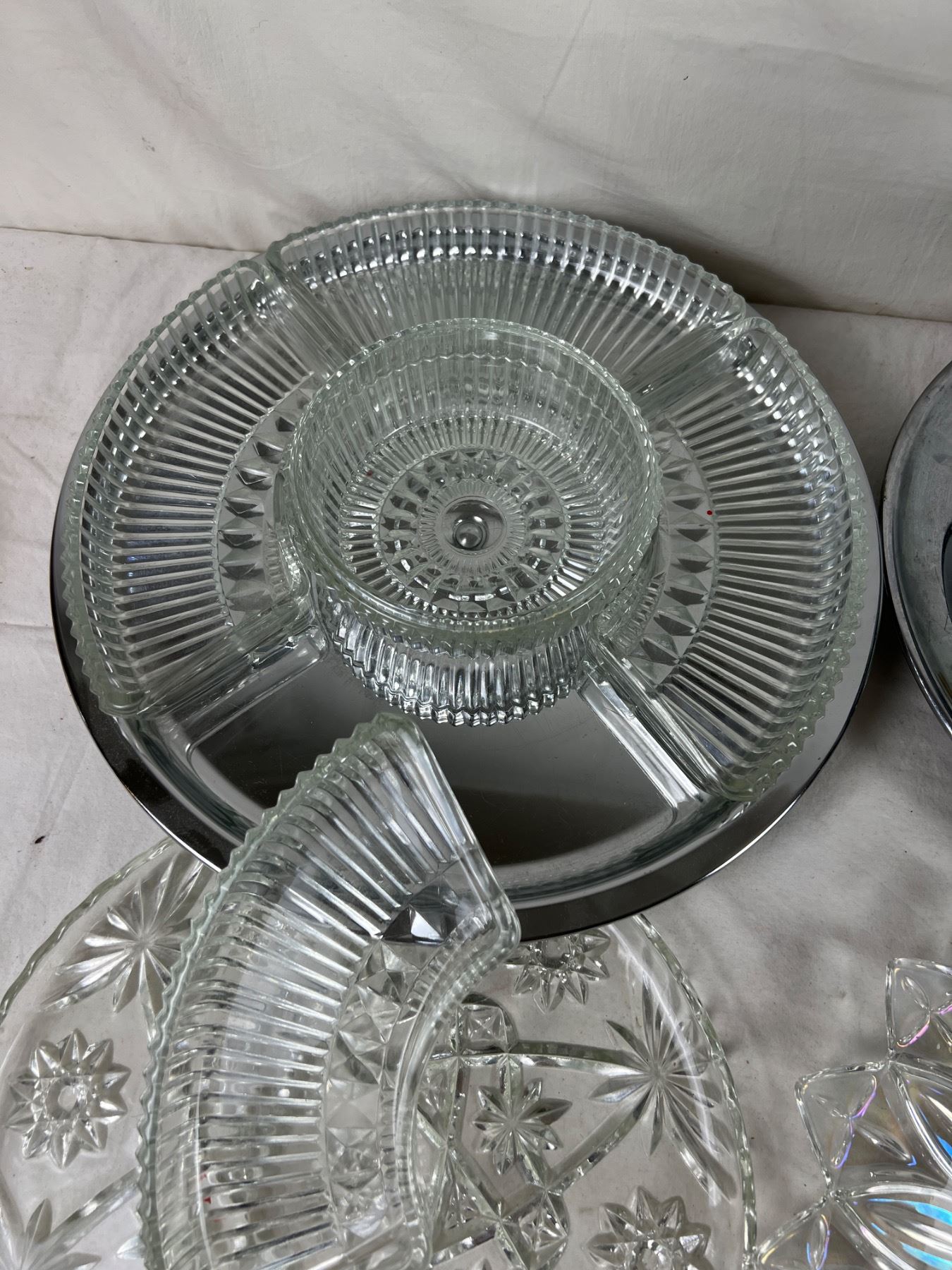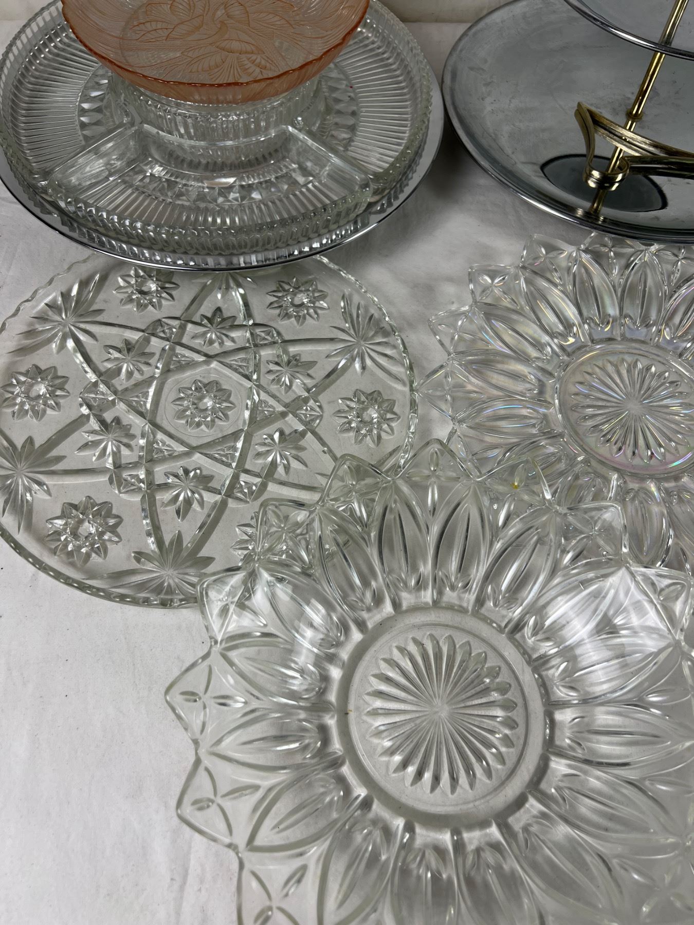 Large interchangeable platter is 14" in diameter. Pink glass piece is depression glass.