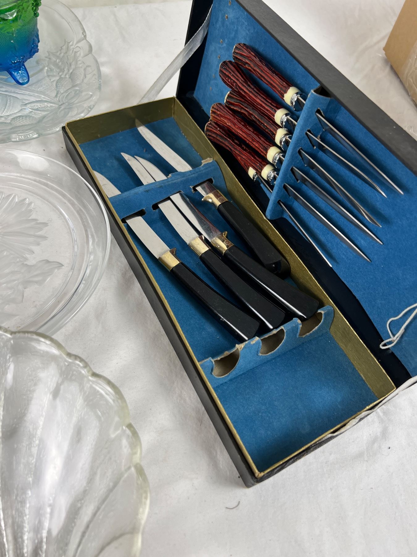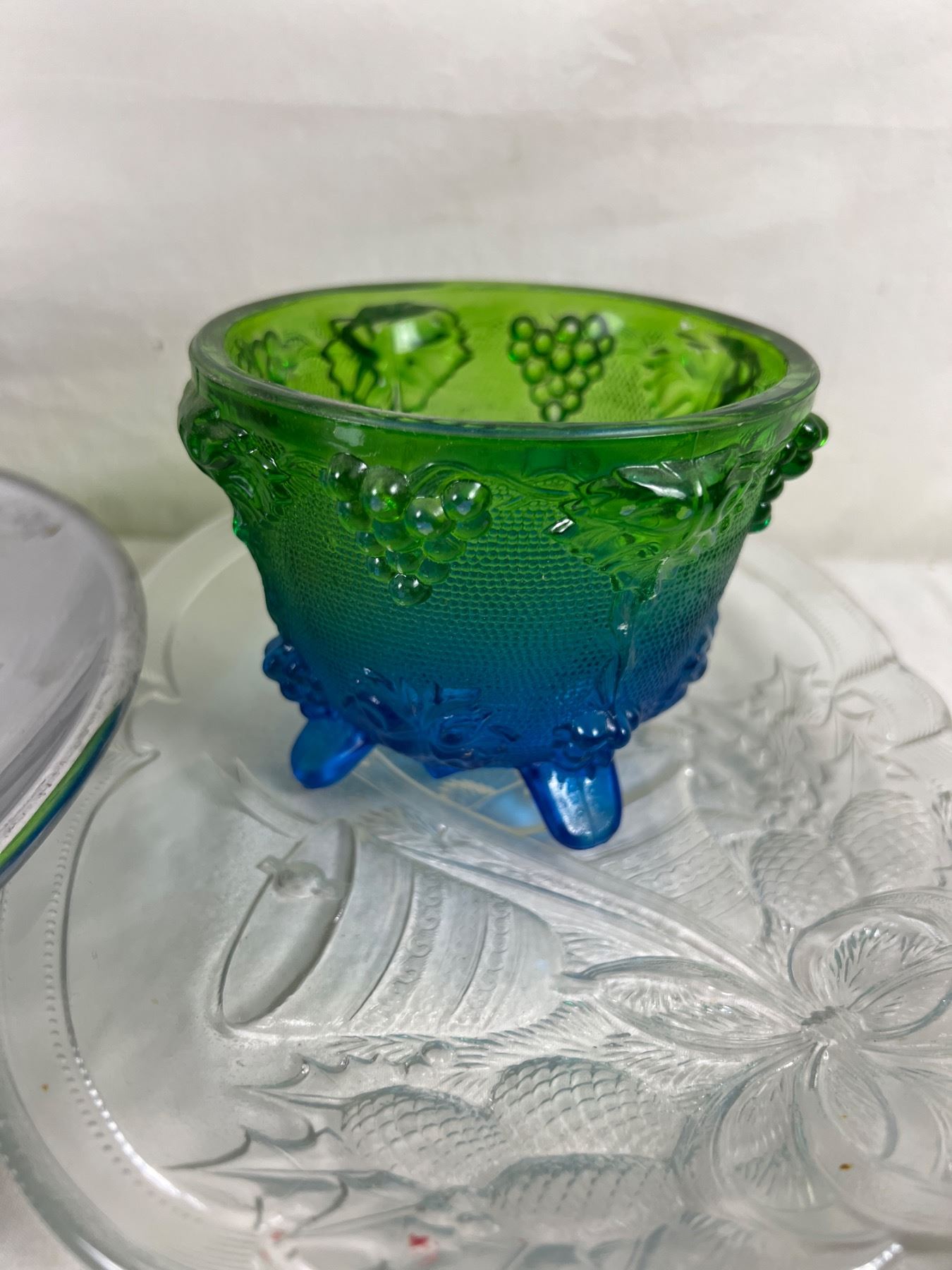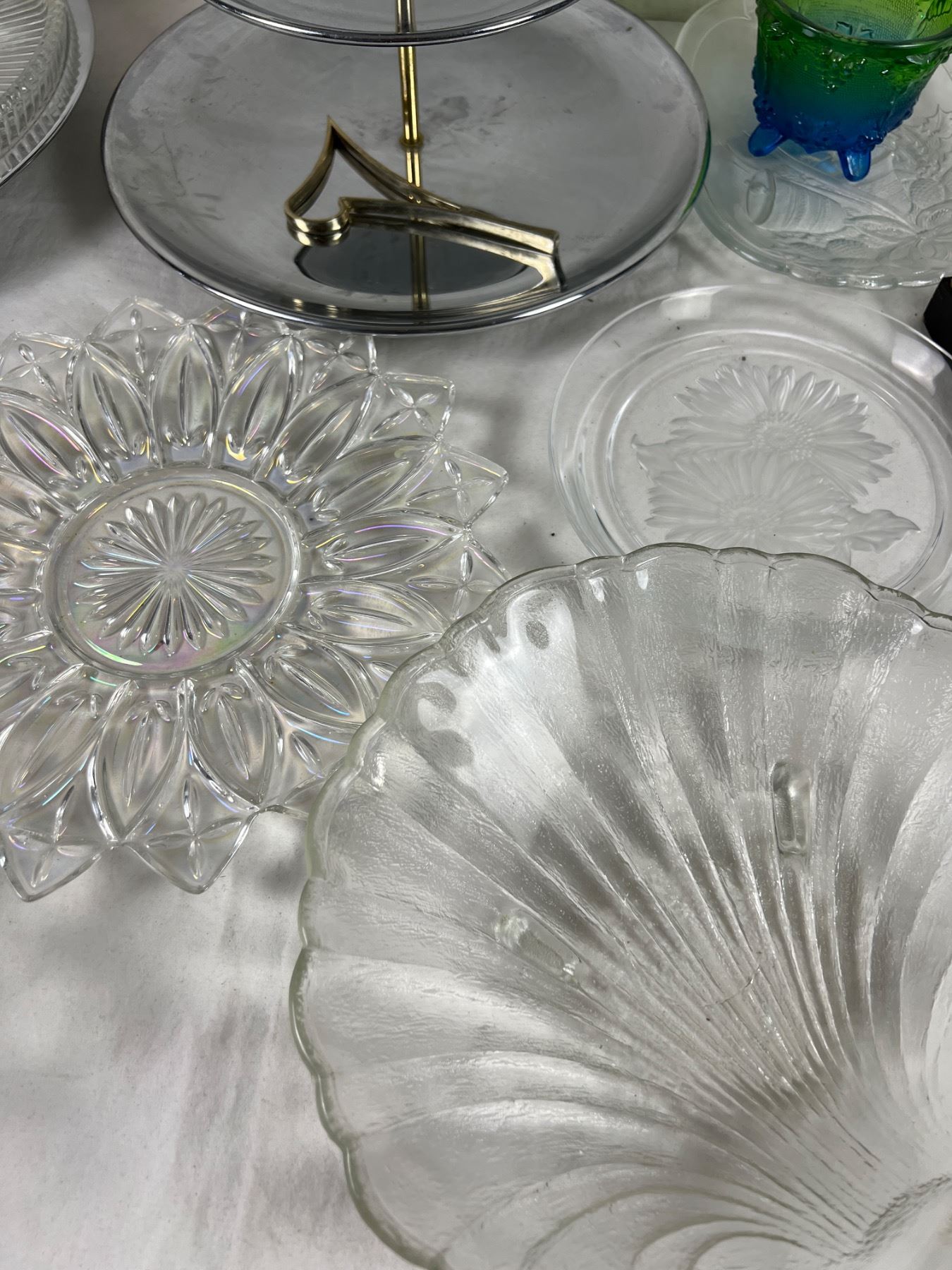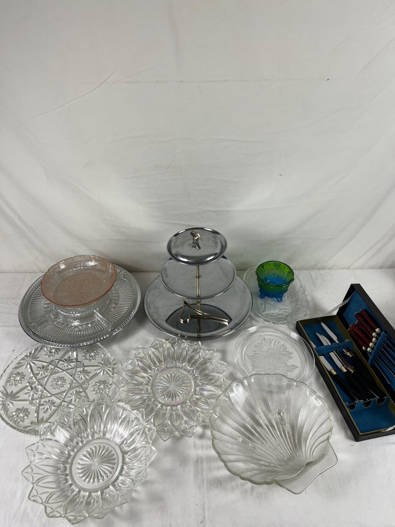 Large interchangeable platter is 14" in diameter. Pink glass piece is depression glass.