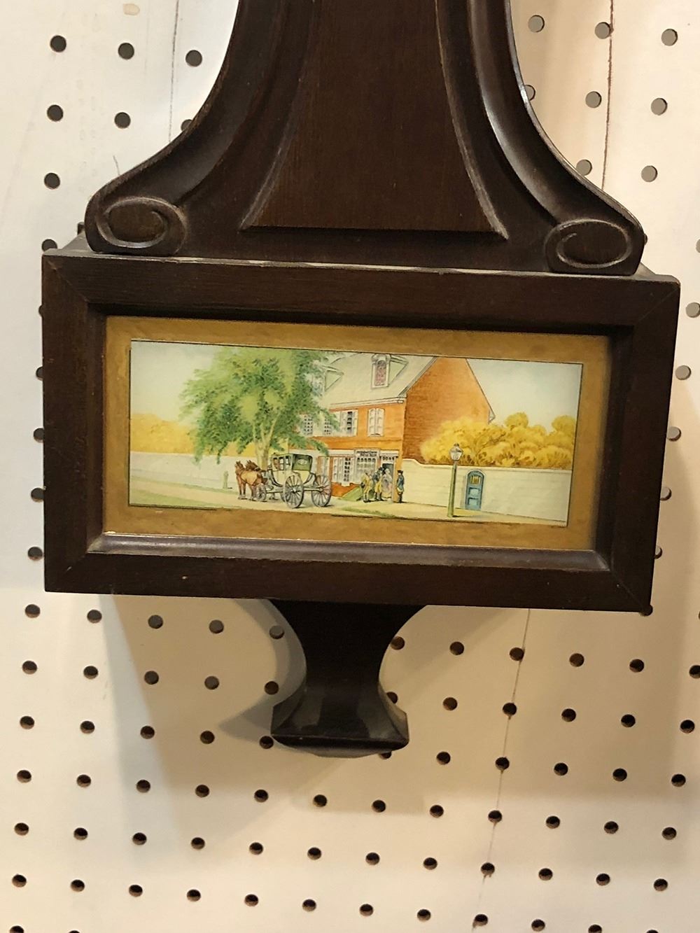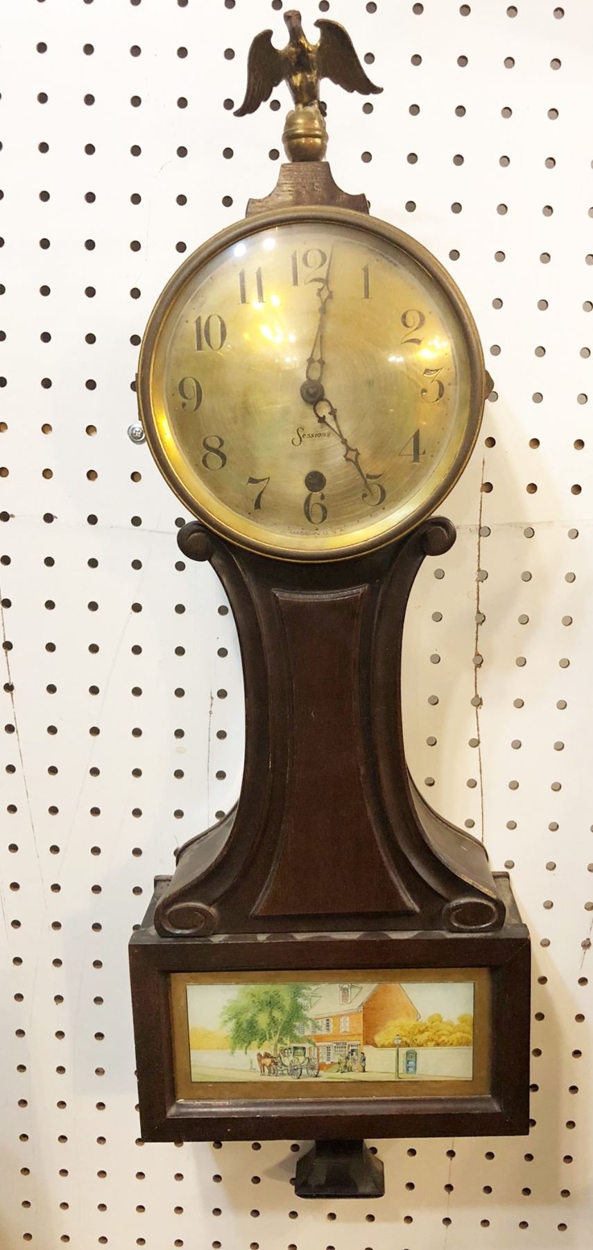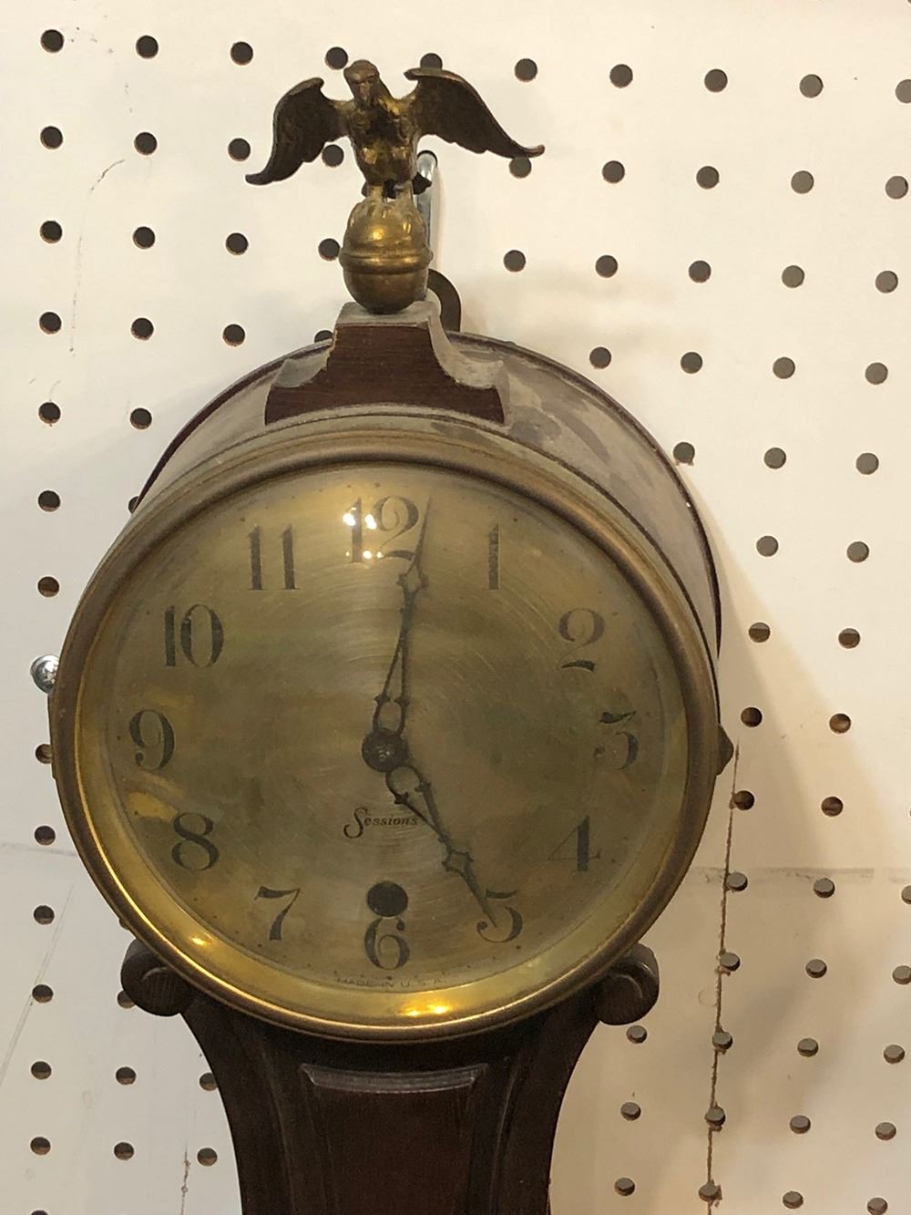 Sessions Banjo clock, key wind, with American eagle finial, measures approx. 26.5” tall (including finial).