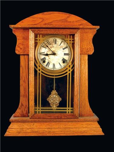 Sessions Clock Company Oak Kitchen Clock, 8 day, half hour strike with key. Face stained otherwise excellent original condition. 15 1/2 X 19 1/2 inches.