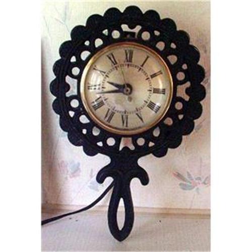 This is the prettiest little kitchen wall clock by Sessions. It is shaped like a trivet and appears to be made of heavy cast aluminum. Keeps perfect time and measures 9 1/2" tall x 6" wide. In fantastic shape.