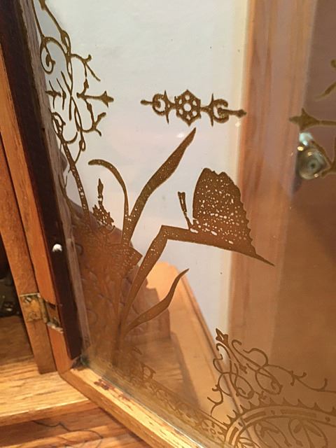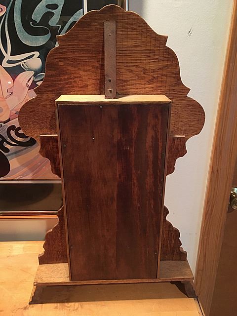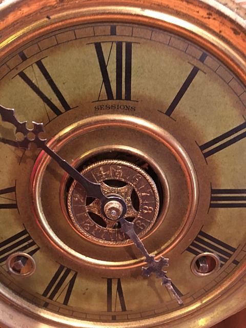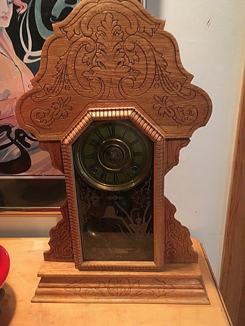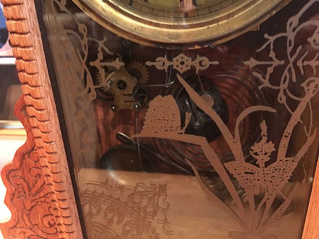 Sessions Gingerbread Shelf clock with alarm, beautiful splat, gold on glass with butterflies and flowers, rope border on door, pendulum and key, measures approx. 25" tall x 15" wide x 4 1/2" deep.